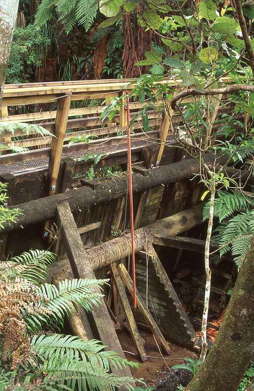 The Thames Water Race was built between 1873 and 1876 to provide the rapidly-expanding town with a water supply. It was originally constructed to power the stamper batteries, which crushed the ore derived from the labyrinth of mines working in the town’s vicinity. It was 14 km long, flowed into the Waiokaraka reservoir and cost £80,000 to build. It was such a significant undertaking that the amount of timber and roading required for its construction had the effect of opening up the valley for subsequent logging. This construction used a huge quantity of timber, all derived from the Kauaeranga.