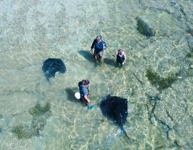 The Reef Ecology tour is a walk over the reef at low tide, you are kitted out in waders to keep you dry. When arriving at the drop off (similar to scenes from the movie Finding Nemo) you stand in the water whilst our resident Short Tail Stingrays and Eagle Ray Stingrays and other reef dwellers swim around at your feet. Let Pancake and Waffle two of our Short Tail stingrays sit on your feet and wait for a gentle stroke, hard to imagine that Stingrays are perceived to be dangerous.