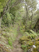 It skirts the lakeshore, but the lake views remain tantalisingly hidden behind the silhouette of foliage. The forest along this section is resplendent with neinei. An informal track on the right (20 minutes) reaches a narrow sandy beach, hemmed in by forest. This is the last glimpse of the lake before the track heads inland.