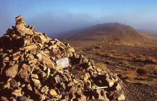 The summit of the range is flat and the poled track continues left for 5 minutes, arriving at a memorial cairn to those of the Heretaunga Tramping Club who died in World War 2. The remains of the footing of Kaweka J Trig (1724 metres) are a little further.