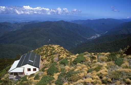 From Powell Hut there are extensive views of the southern Tararuas and Wairarapa Plains. The Waiohine River threads a silvery course between the main Tararua Range and subsidiary range to the south-west. Donnelly Flats and Holdsworth are clearly visible.