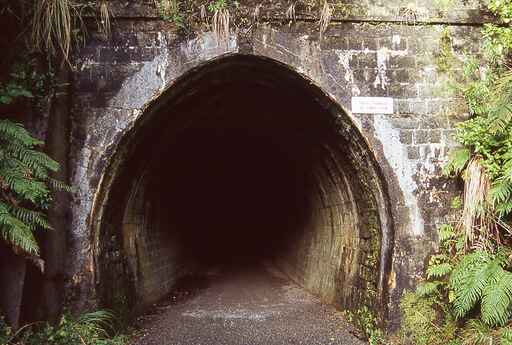 The 90-metre-long Pakuratahi Tunnel was constructed in 1876. The straight side walls are made of poured concrete and the arched upper section of 13,500 compressed sand and cement blocks, fabricated in situ.