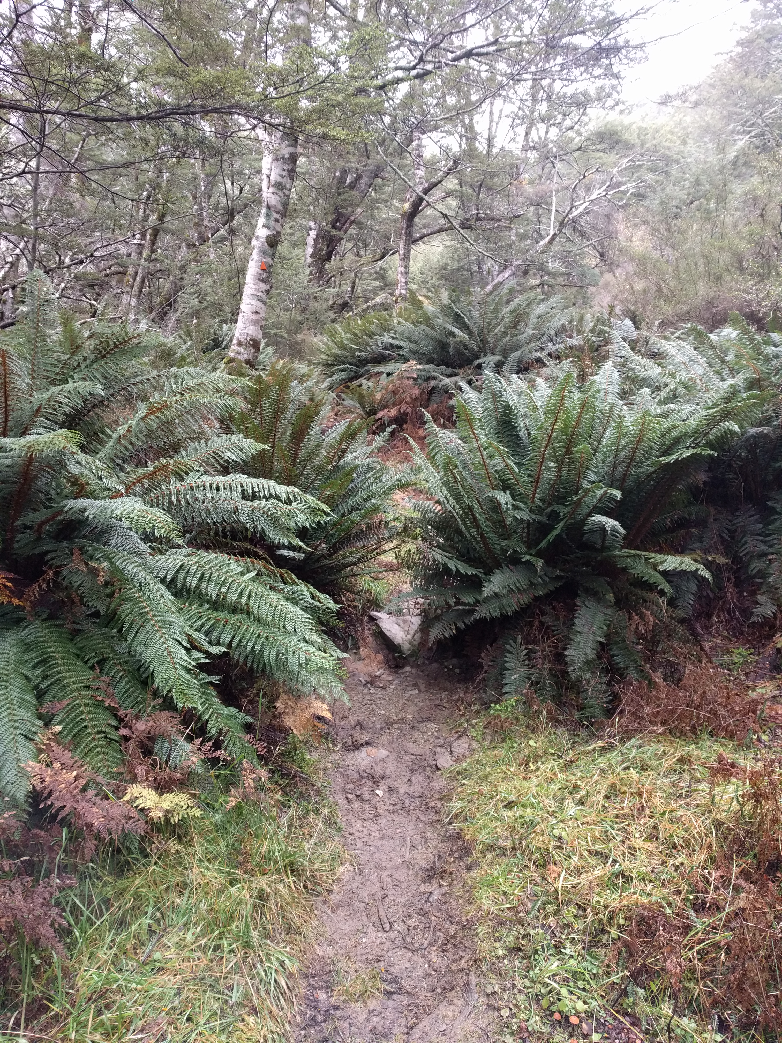 The track enters the towering beech forest and climbs progressively. Crown ferns and mossy patches carpet the forest floor. Approaching the treeline views of the impressive basin appear above.