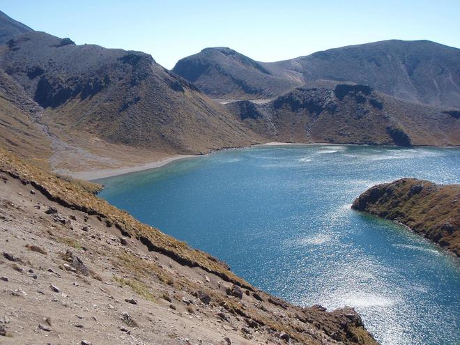 At the junction with Taranaki Falls, head right at the signpost. The views of Ruapehu to the south and Tongariro and Ngauruhoe to the north get increasingly spectacular as you weave through gullies descending from the flanks of Ruapehu’s northern slopes. There is one stream crossing which can be negotiated with stepping stones, shortly before the signposted junction to the lakes.