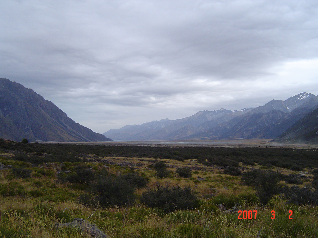 On the opposite side of the valley are peaks such as Mount Blackburn, The Nuns Veil and The Acolyte. Mount Tasman is concealed in the far distance.