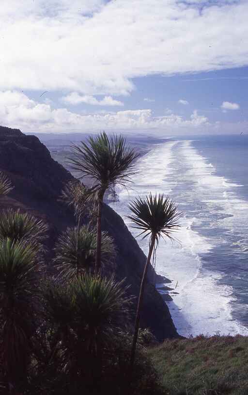 Maunganui Bluff rises to nearly 500 metres above sea level and protrudes from a tumultuous sea in sheer cliffs. Views from the summit stretch endlessly in all directions. To the south, the white capped breakers of Ripiro Beach retreat to a blur on the salt laden horizon. To the north lie the low former dunes of the Waipoua coast and to the east the Tutamoe Range.