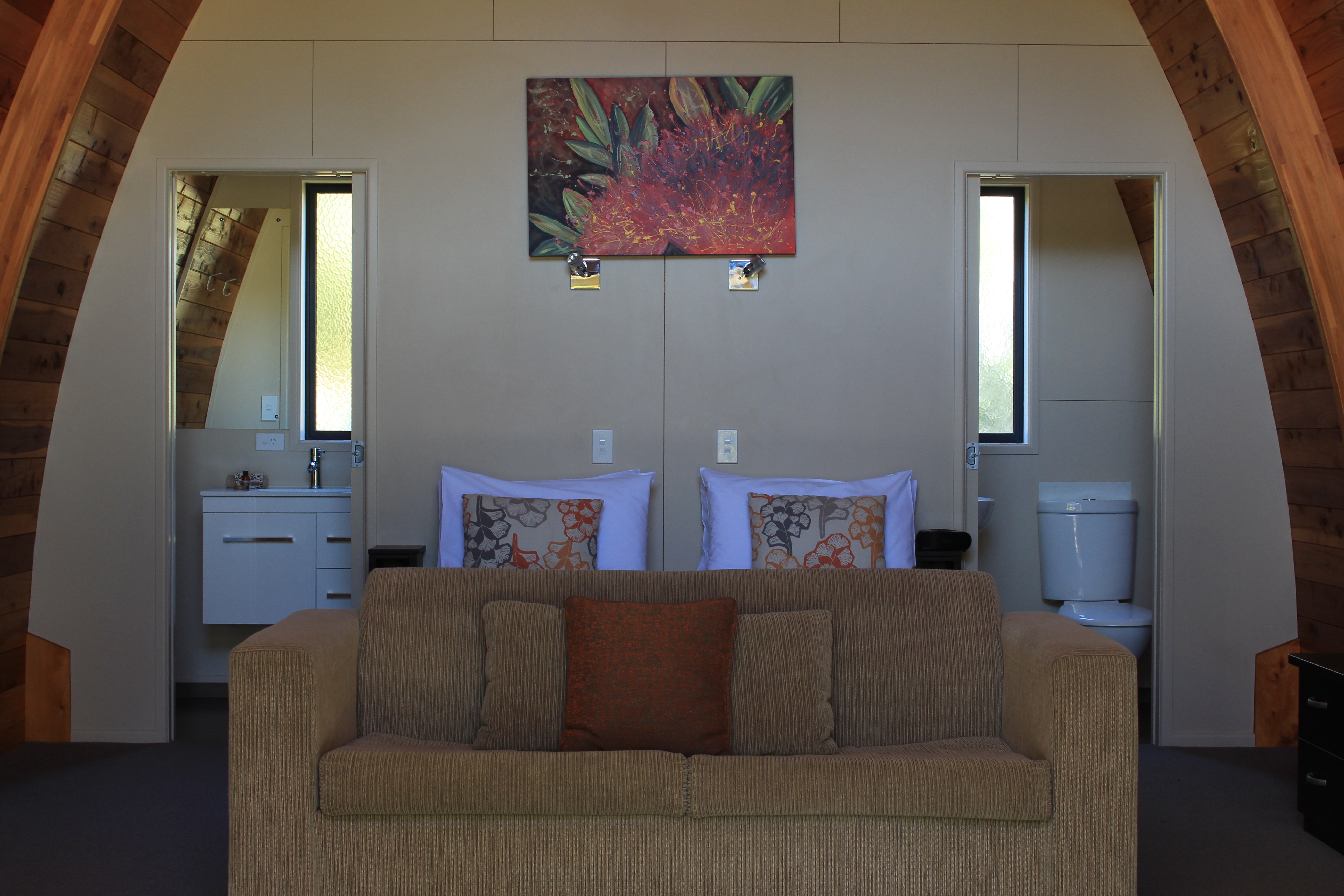 These uniquely designed villas are handcrafted from New Zealand grown timber. They are open plan with king bed and sofa, kitchen, bathroom and TV.