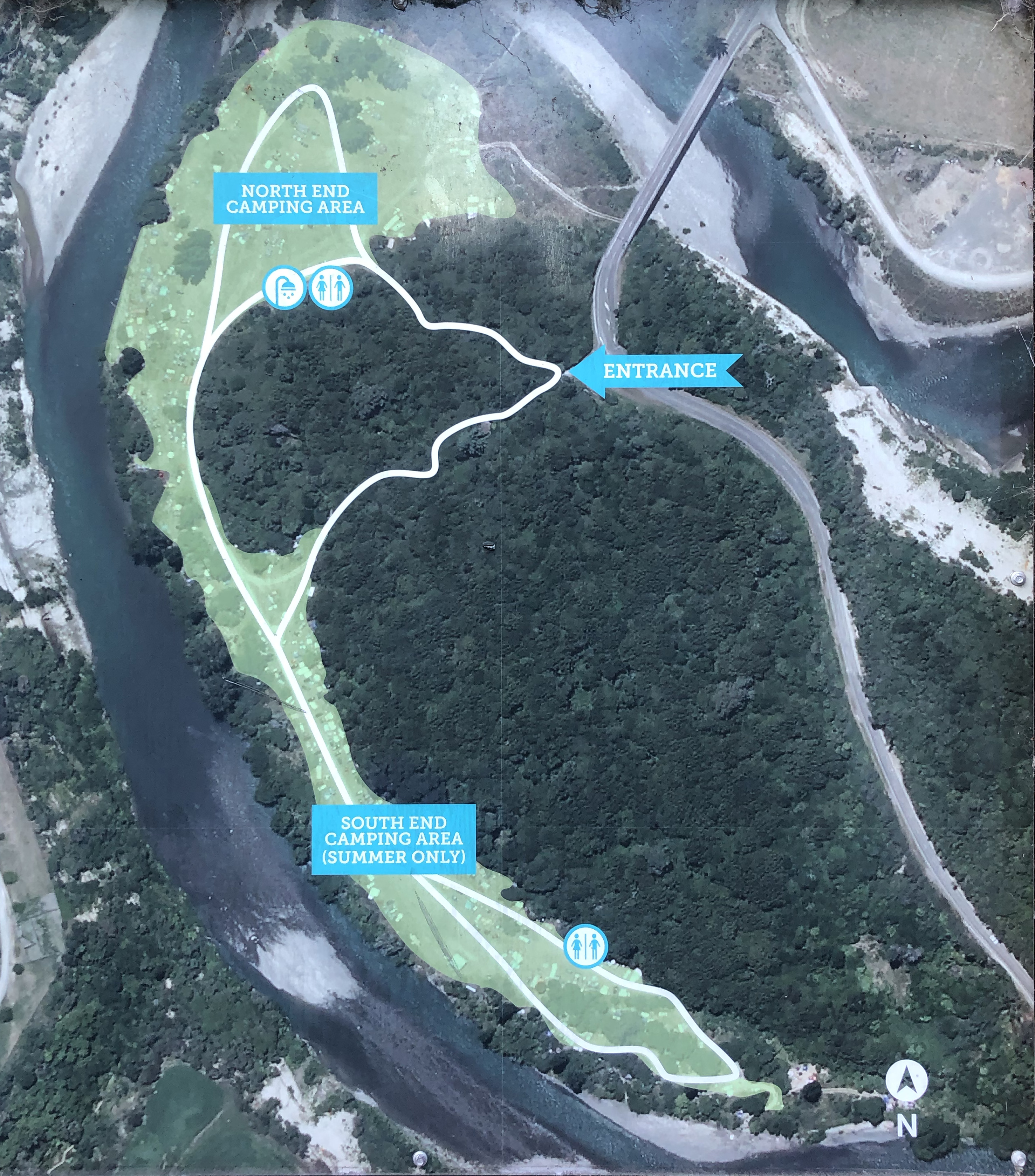 There are large open grass areas to recreate and a great river for swimming, canoeing, and fishing. There are two main camping areas shown on the map.