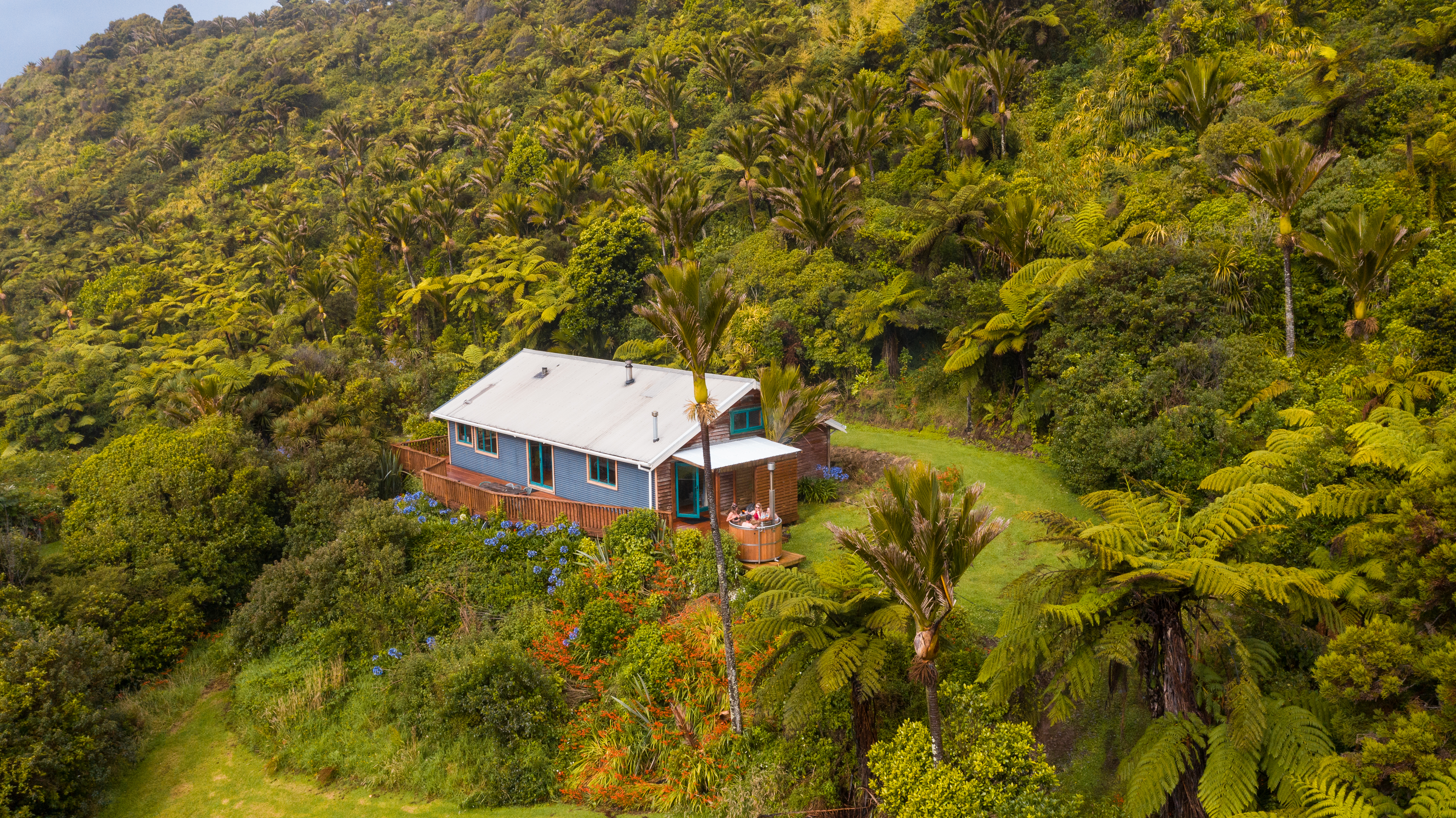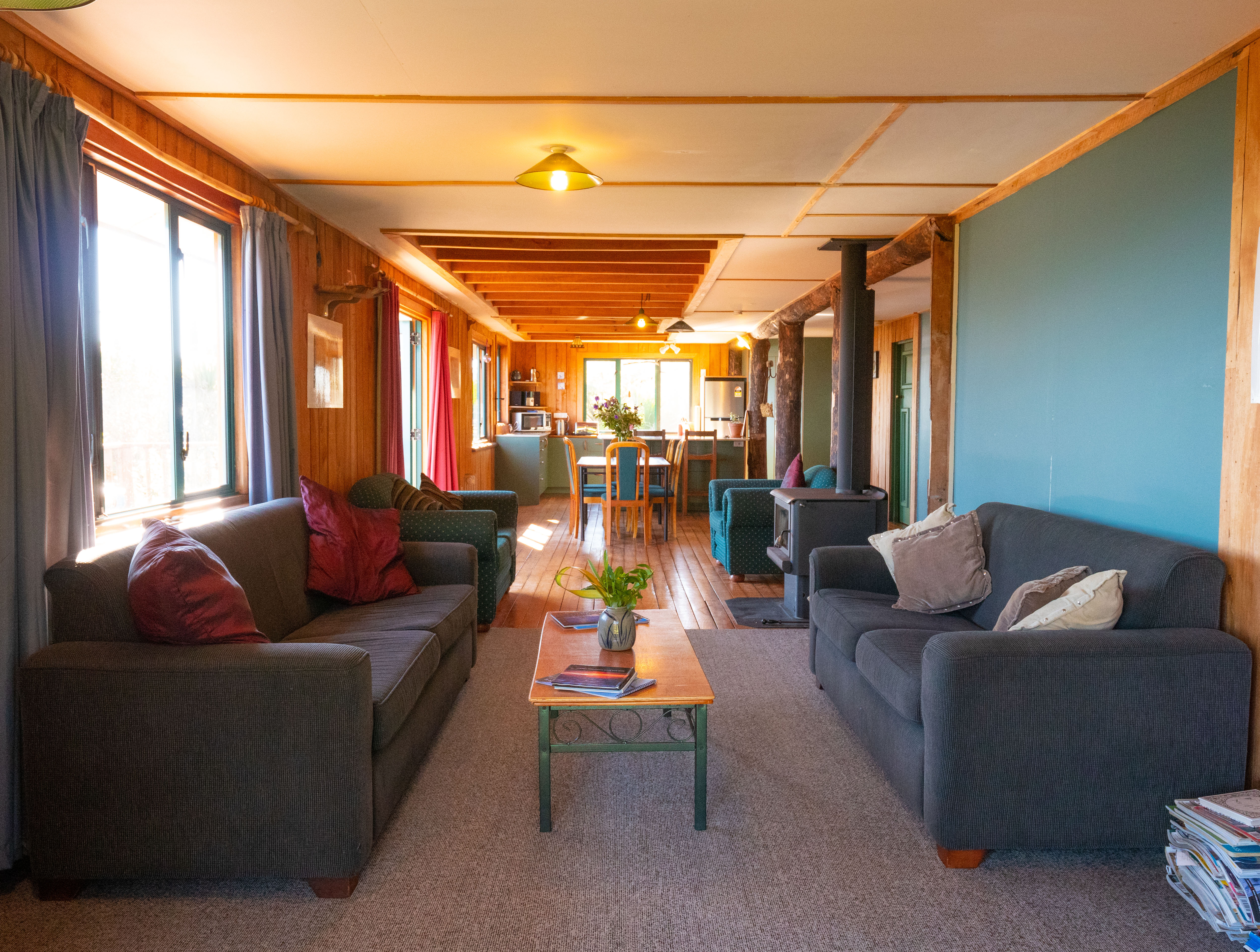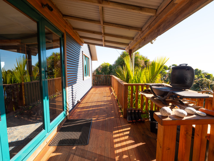 A fully equipped kitchen and open plan style living room opens out onto a large deck putting you amongst the surrounding native virgin forest and offers spectacular views of the Tasman Sea, which is a stones throw away. A perfect spot to watch the local Hector dolphins which are often seen playing in the waves.