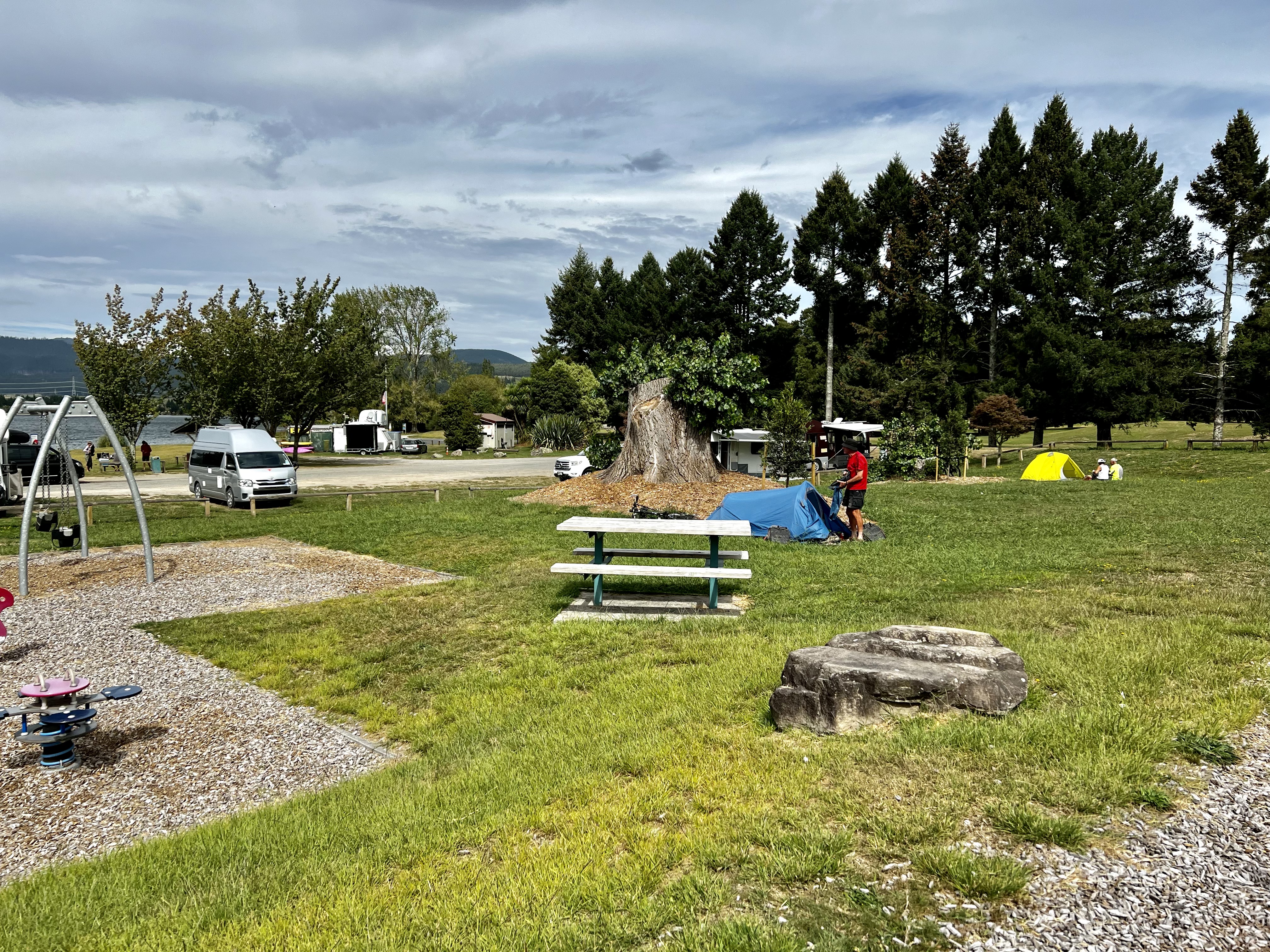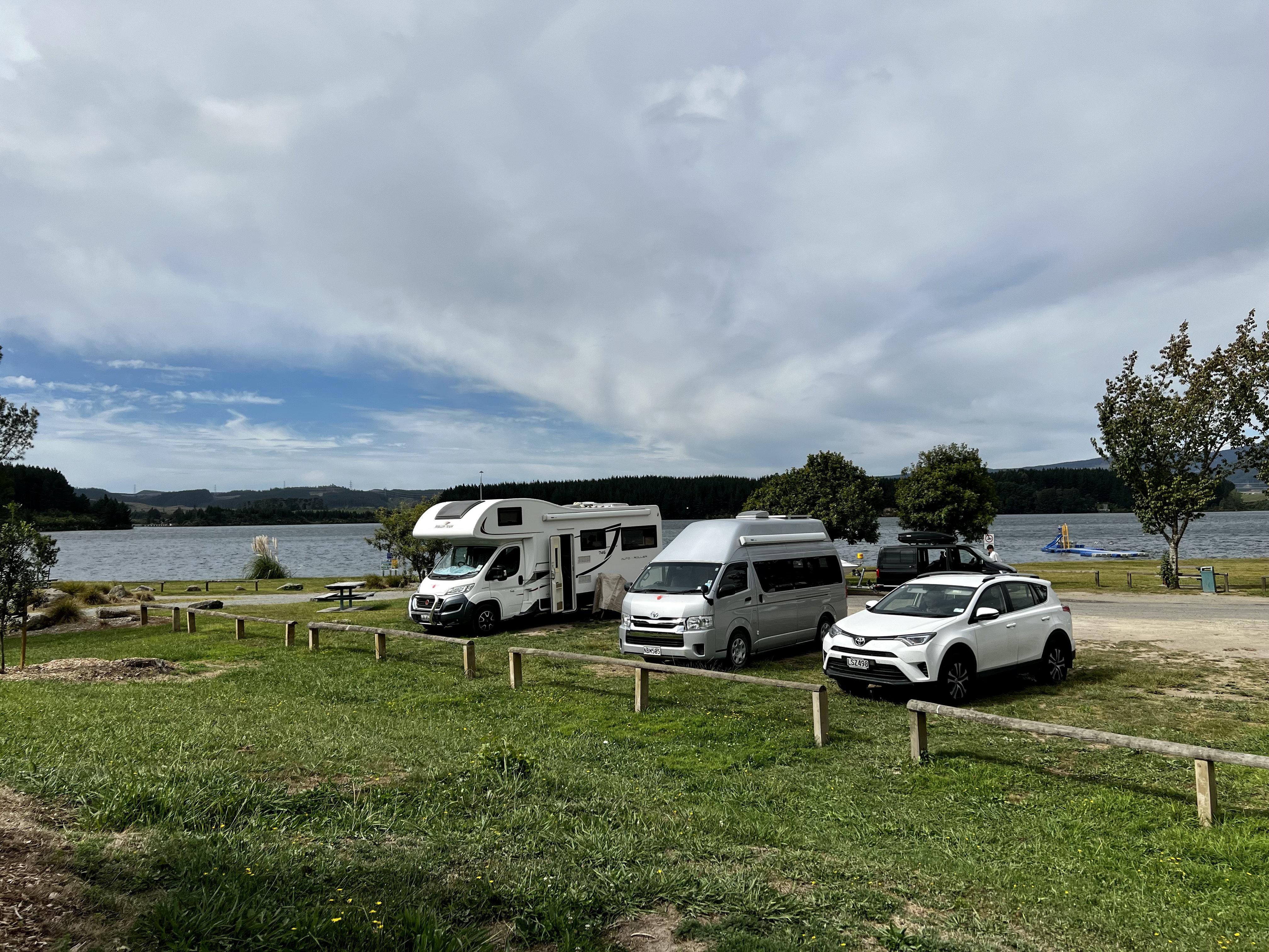 Free camping on the Mangakino Recreation reserve on the shore of Lake Maraetai.