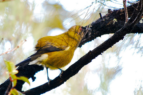 The enchanting calls of the bellbird Anthornis melanura are one of the most captivating sounds of the New Zealand forest. The bellbird is often heard, but rarely seen, as its sweet song is carried through the vegetation. These bell-like notes are learned from neighbouring adults of the same sex or parents. Often bellbirds are heard in tandem, singing and counter-singing to determine territorial spacing. Pairs are monogamous and may duet. These honeyeaters take nectar from many native trees. In autumn, by feeding on berries, they act as important seed-dispersing agents in the ecology of the forest.