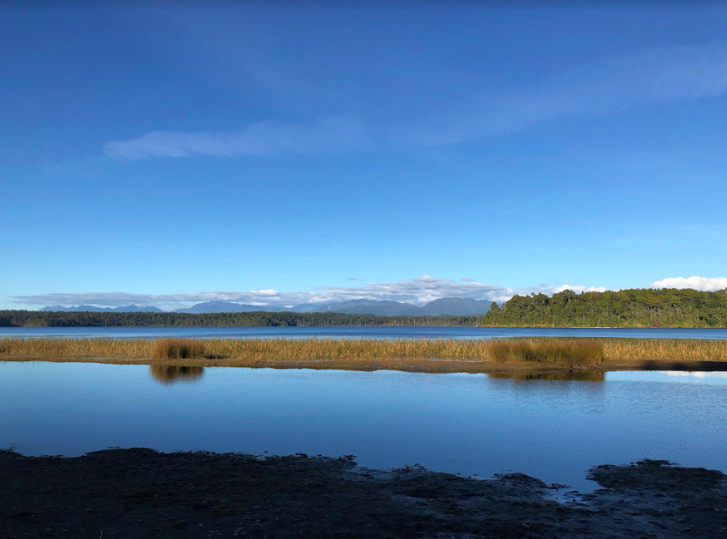 Lake Mahinapua was formed when the Hokitika Glacier met the Tasman Sea. The retreating glacier dumped a moraine wall and dunes were built up by the sea. The Hokitika River flowed into the lake, creating an estuary sandwiched between the dunes and moraines. When the river changed course, the lake was left in the hollow.