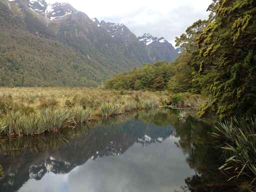 A clever DoC sign is written in mirror writing so that when the lakes area absolutely calm, the word ‘Mirror Lakes’ appears readable in the reflection on the water.