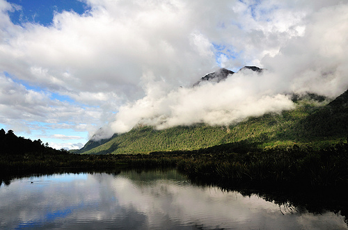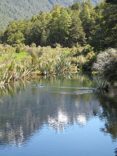 Mirror Lakes obviously take their name from the clarity and stillness of water in the early morning. On still days the water’s surface is glassy smooth and reflects perfectly the Earl Mountains and flax bordering the lakes.