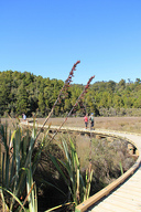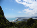 Snake over the wetland boardwalk before climbing past some strategically placed benches - one overlooking the wetland, the other the sea. At a cutting the track heads left and climbs more steeply past lofty straight-boled rimu to the viewing platform at the trig (158m). This is one of the prime viewpoints of the Southern Alps highest peaks.