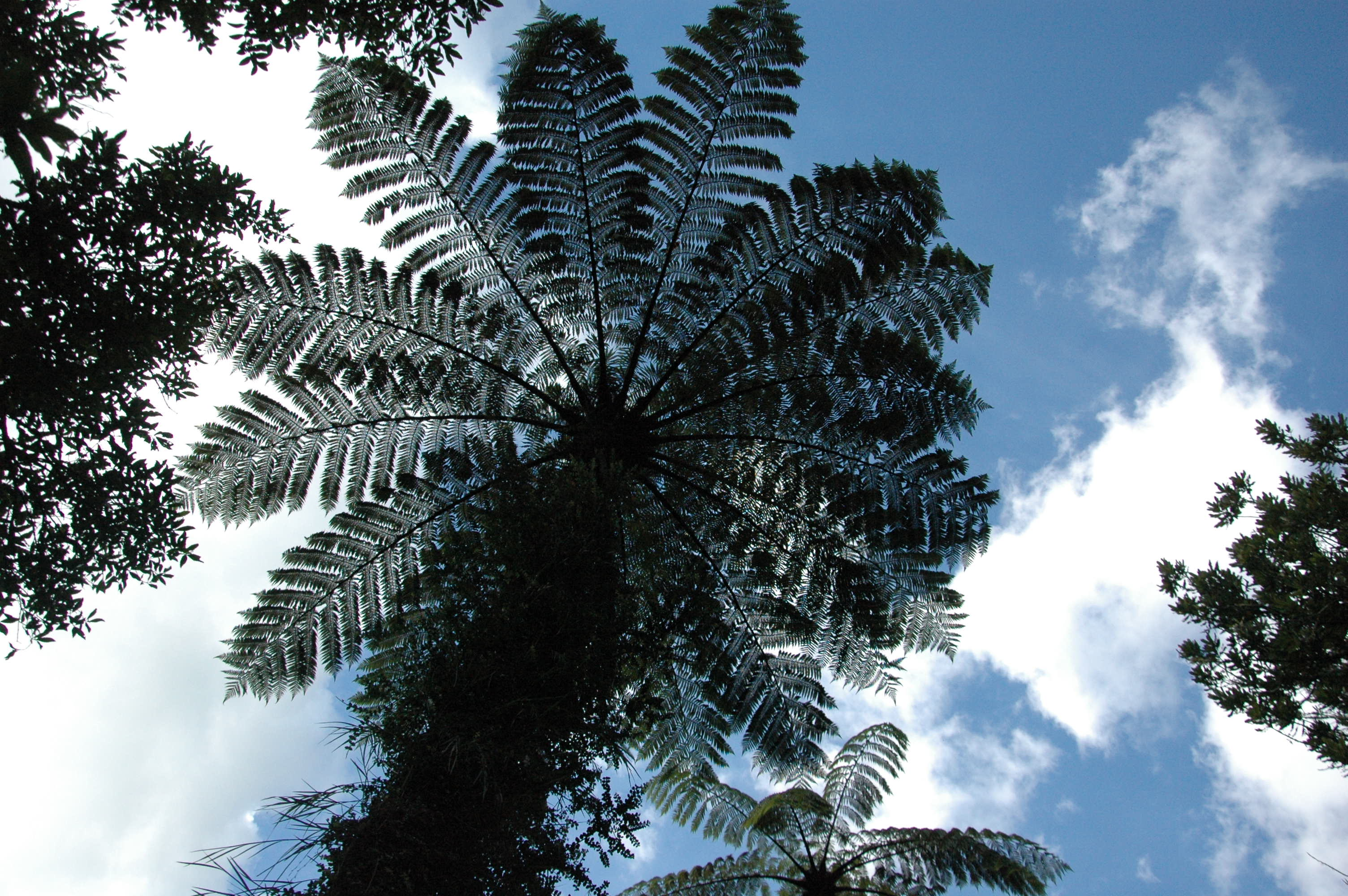 The nikau is the most southerly naturally growing palm in the world, with leaves up to 3 metres long and 2 metres wide. The coral-like flowers grow on spikes below the crown and above the trunk, ringed by closely spaced leaf scars. It takes 20 years for a nikau to get out of the ground. It then looses 3-4 fronds per year, each leaving an equatorial scar. So to age a tree, count the scars, divide by 3 or 4 and add 20.