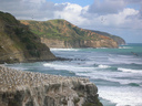Above Maori Bay, interesting rock formations in the cliffs give clues to their geological past. The radiating spikes of angular rock are known as pillow lava and formed during the undersea eruption of molten rock.