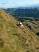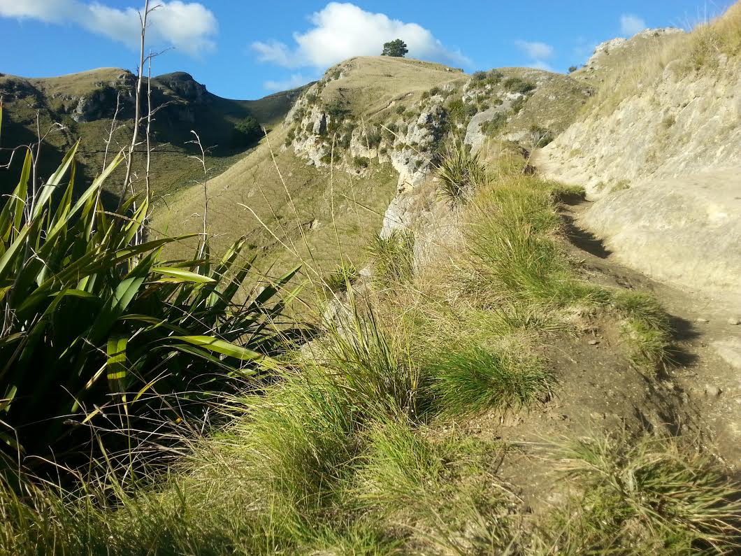 The track then descends a bowl, with fine views south up the Tukituki Valley to Kahuranaki (646 metres). Flax clings tenaciously to the exposed limestone and the parched grass highlights the ridgetops in summer’s early morning light.