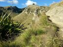 The Rongokako Trail departs to the left of the road (looking uphill) and follows the spine of the ridge above the bluffs. The track is uneven and steep in places. Spectacular views are the reward at the Saddle Lookout and Summit trig (399 metres).