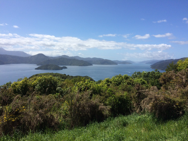 The metalled track undulates along the ridge top. There are views west to the bays of Queen Charlotte Sound, from Onahau Bay to Blackwood Bay. These culminate after 30 minutes at the Queen Charlotte Viewpoint, which looks straight up the axis of the sound. The snouts of the protruding headlands interweave in harmony. You can easily imagine how this was once a valley system before inundation by the sea. An information panel provides a panorama with the bays named and some history.