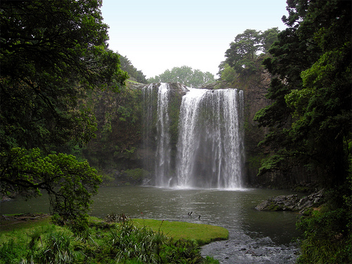 The Whangarei Falls are 26-metres-high and cascade in a frothing maelstrom over a solidified basalt lava flow, thought to be around 2.5 million years old.