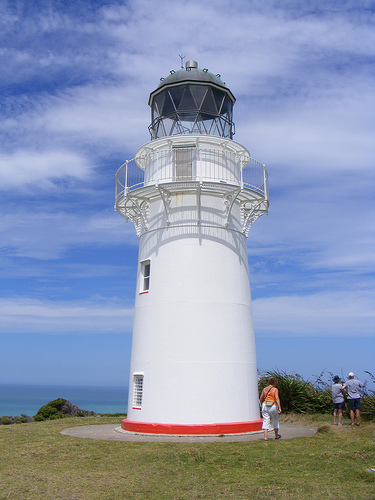 East Cape Lighthouse is New Zealand’s easternmost lighthouse at longitude 178 degrees 33 minutes East. The tower is constructed from cast iron sections bolted together and is 14-metres-high. It has remained on this site since 1922, having been removed from East Island due to frequent landslides. It stands 154 metres above sea level and the light flashes once every 10 seconds. The 1000-Watt lamp is mains powered with a diesel alternator for standby. Like all New Zealand lighthouses it is controlled by computer from Wellington.
