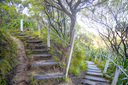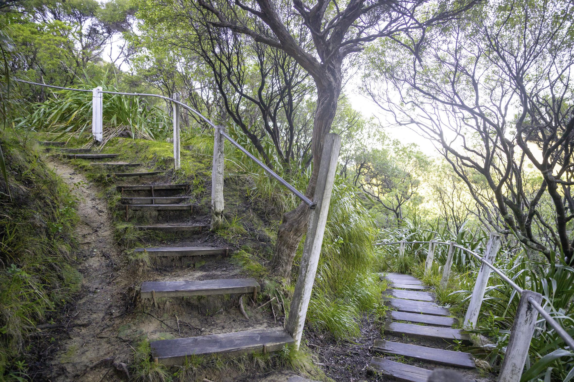The track climbs the cape steeply with the aid of handrails and several hundred steps. These wooden steps can be slippery when wet in the morning dew and patches in between may be muddy.