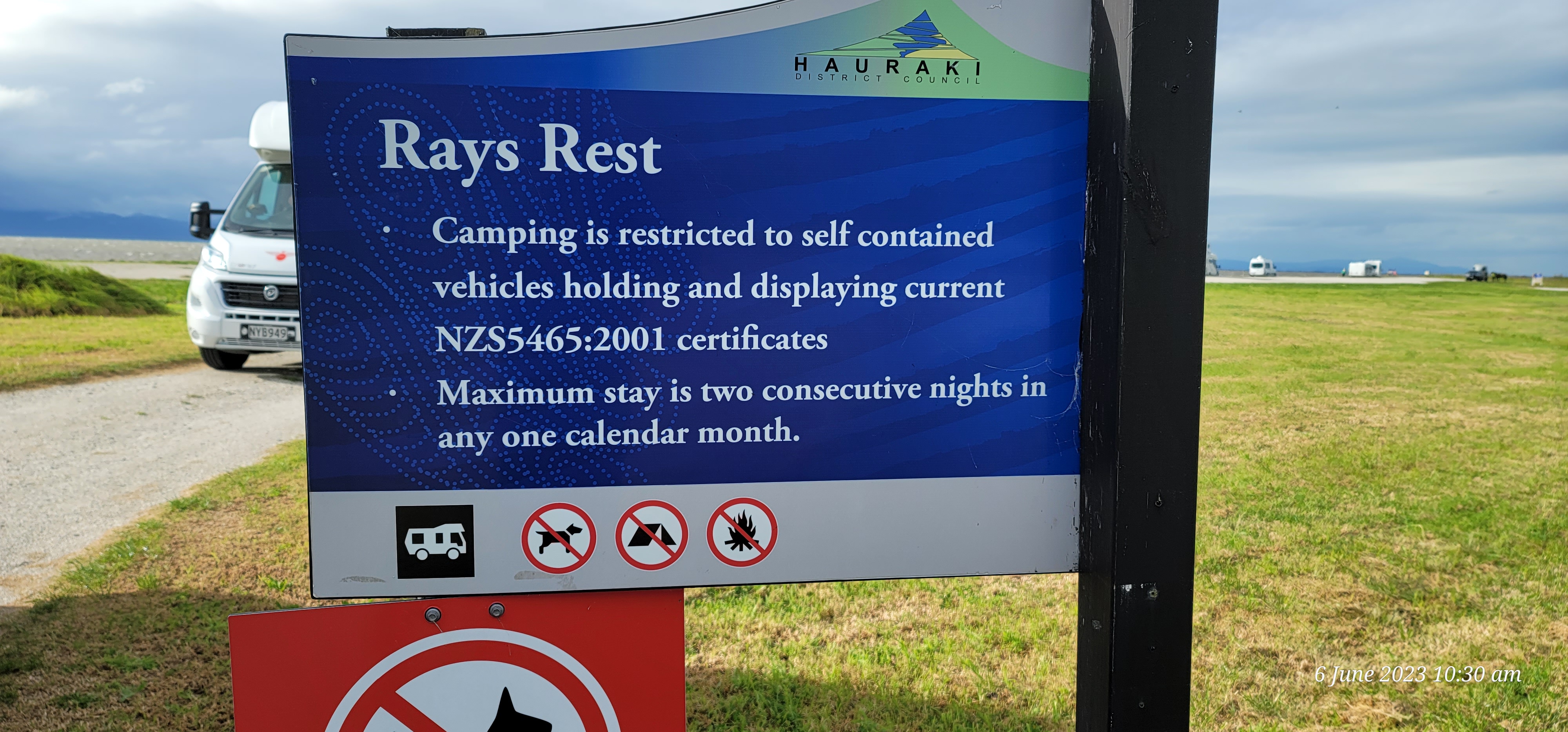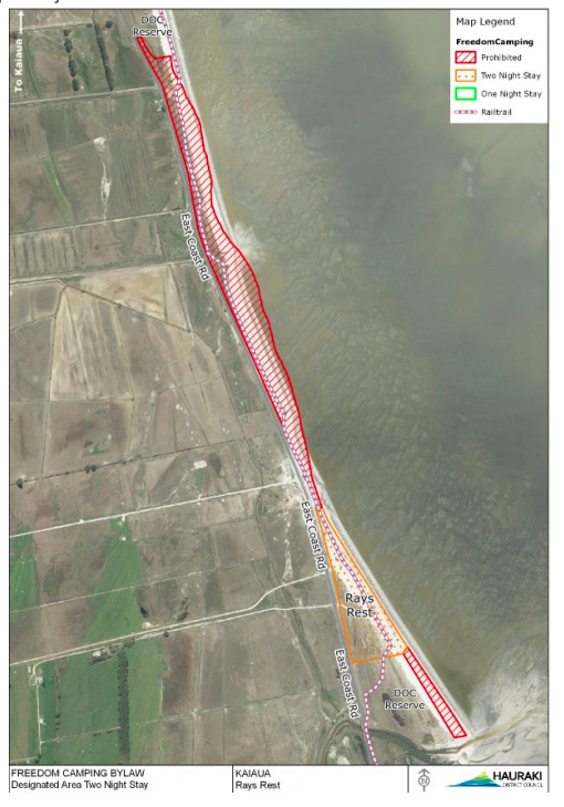 Freedom camping is prohibited on the southern end and northern part of Rays Rest Reserve, including the beach. The reserve is off East Coast Road, approximately 4 km south of the Kaiaua township and adjacent to the Firth of Thames.