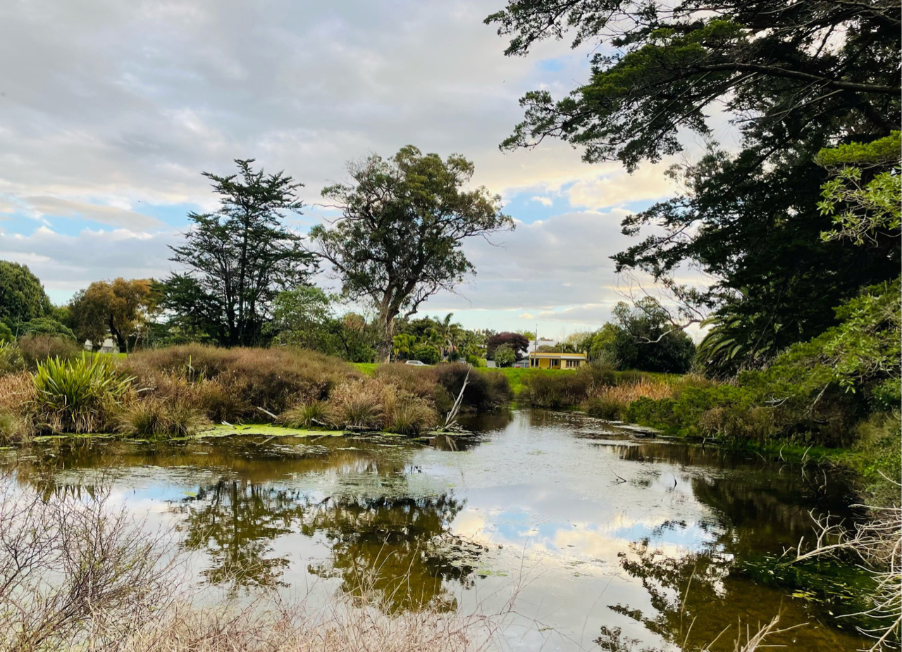 Lovely green park right next to the beach with clean bathrooms garbage collection and birdsong.