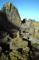 Red Rocks are purple-coloured remnants of undersea volcanic eruptions which took place around 200 million years ago. When basaltic lava bubbles made contact with cold water, the outer skin of molten magma cooled, whilst the enclosed molten rock continued to flow under pressure. It penetrated a weakness in its encasing shell of rock and exploded like a water-filled balloon, forming a pillow shape. Red Rocks are stained red due to the presence of iron oxide and contrast with the pistachio green rocks tainted by chlorite.