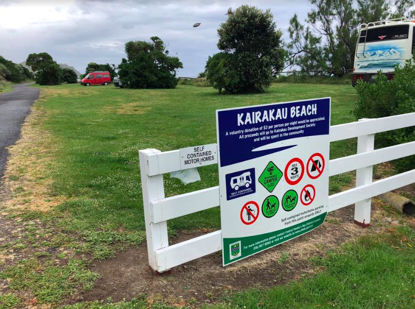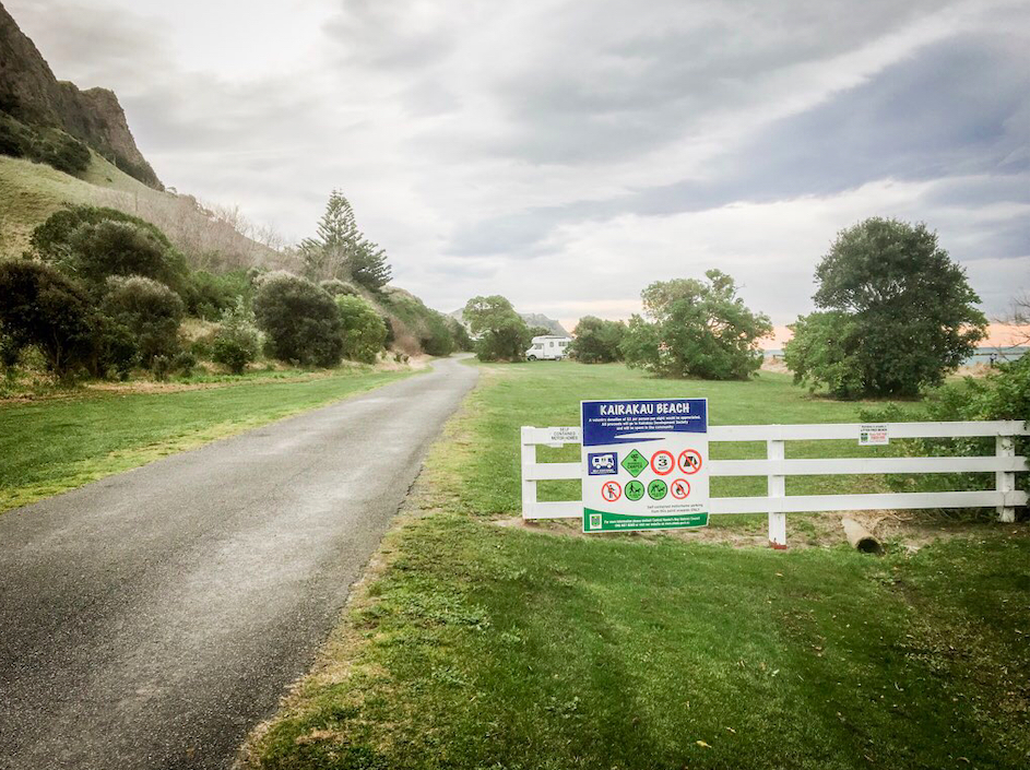 Camp on the area of grass at the northern end of Kairakau Beach Road (past the new public toilet). The area allowed to be used is clearly signposted.