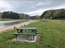 There was only one other camper there so we had the view and the beach to ourselves. Gorgeous sandy beach boarded with bolders ideal for climbing at one end and a beautiful river that feeds into the sea at the other.