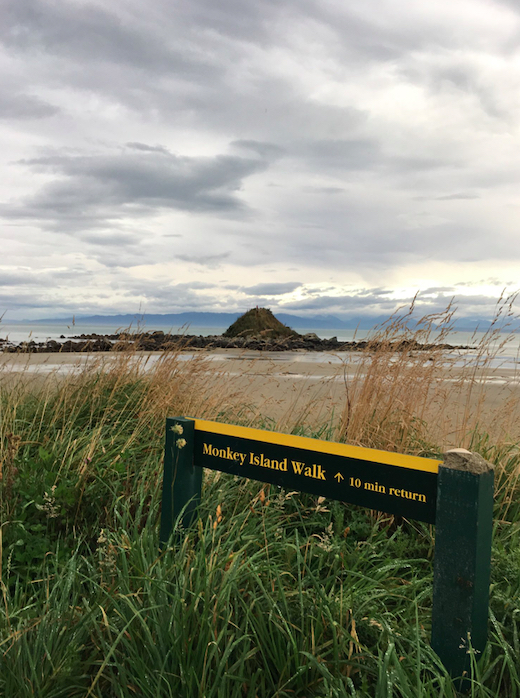 Monkey Island can be reached by foot at a low tide, and offers good views of the beach and distant mountains.
