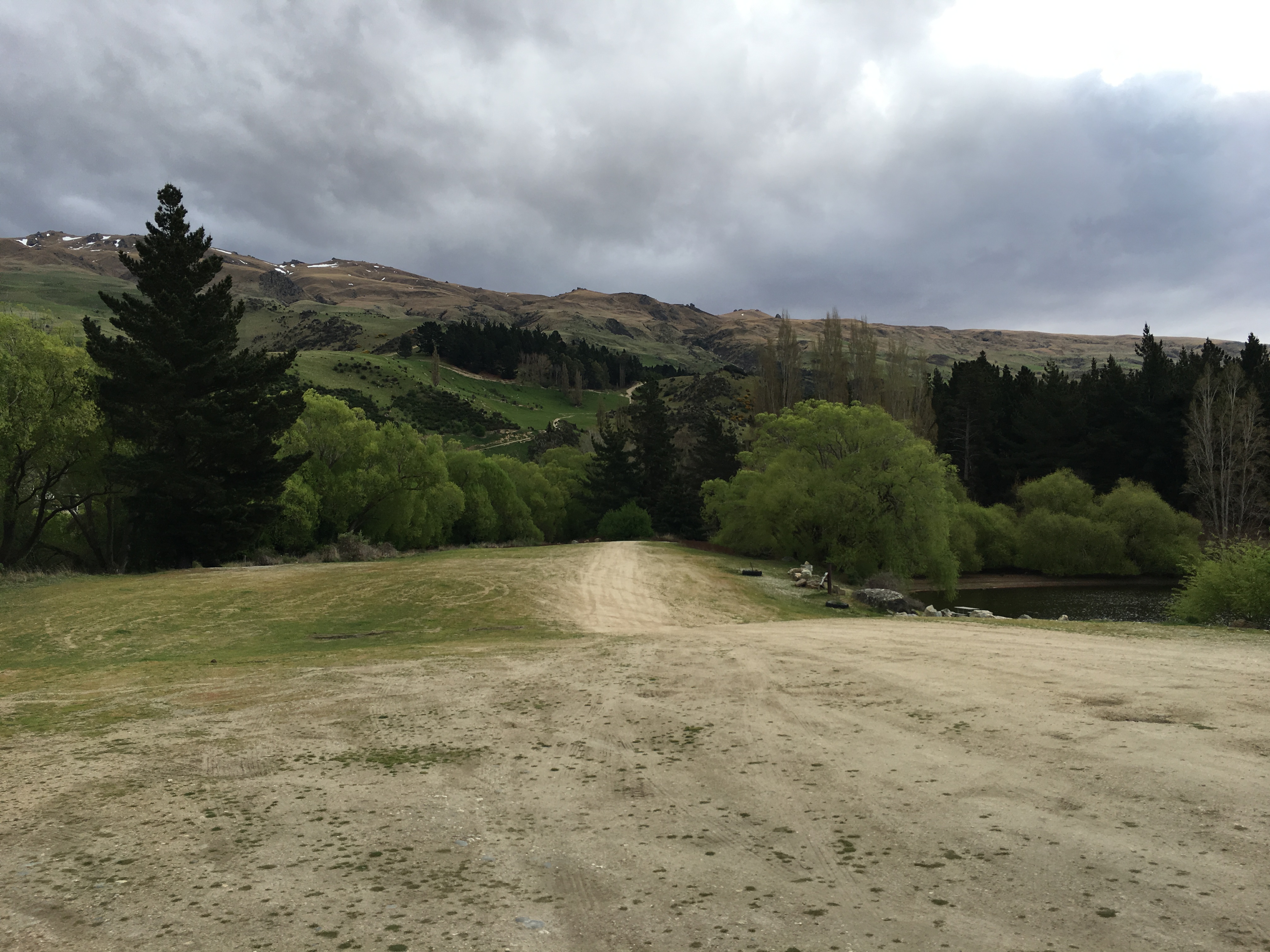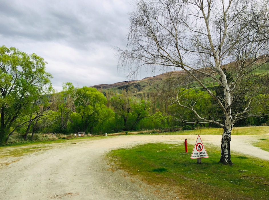 It is a large uneven dirt parking area without much charm. A bonus is that it is on Clutha Gold trail.