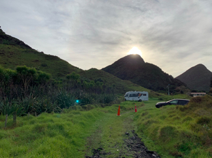 Beautiful black sand beach to walk to as well as the sea caves to explore. Be sure to stay long enough to check them both out. The black sand is much darker than in Piha. Composting toilets and cold showers with curtains for privacy. Worth the little extra money to stay here instead of in a car park.