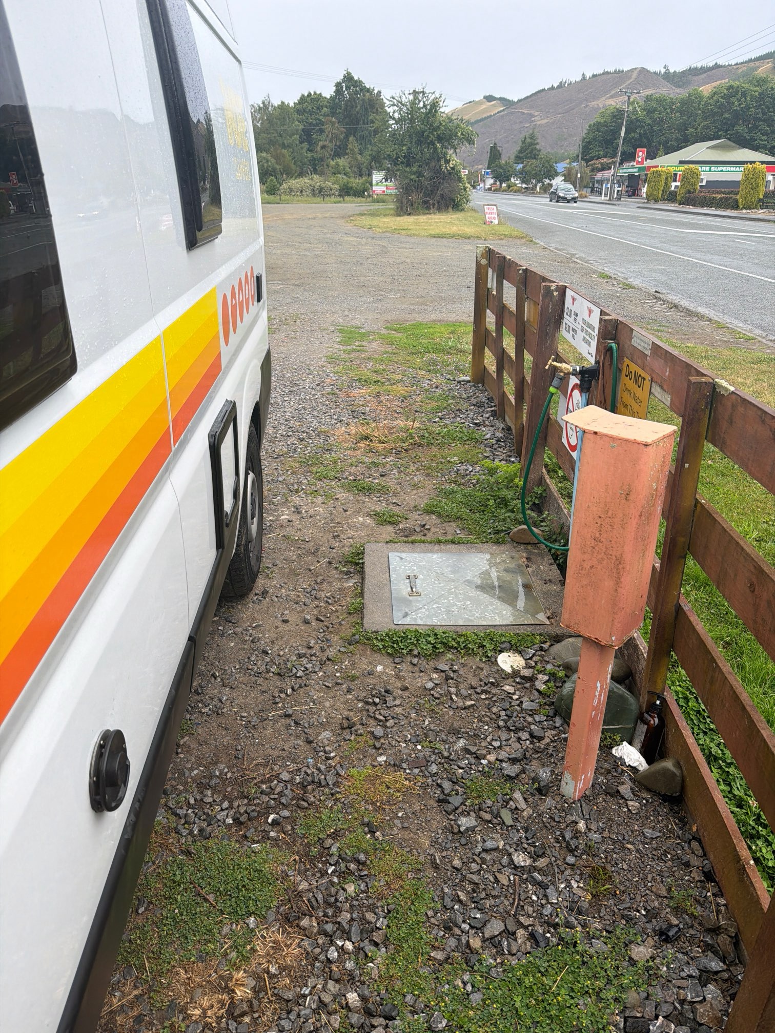 The dump station is almost opposite the super market on the main road, there is drinking water and an area to dispose of grey water but no refuse. Key your eyes peeled as you will miss it, there is just a small wooden fence supporting the taps.
