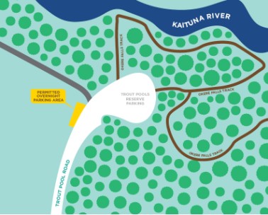 It is a very spacious carpark (no shade) surrounded by beautiful bush. The Okere Falls and caves are worth visiting. However, the carpark is used by a rafting company to pick up boats and guests after their tour on the river, so it is extremely busy with buses, trailers and people the whole time.
