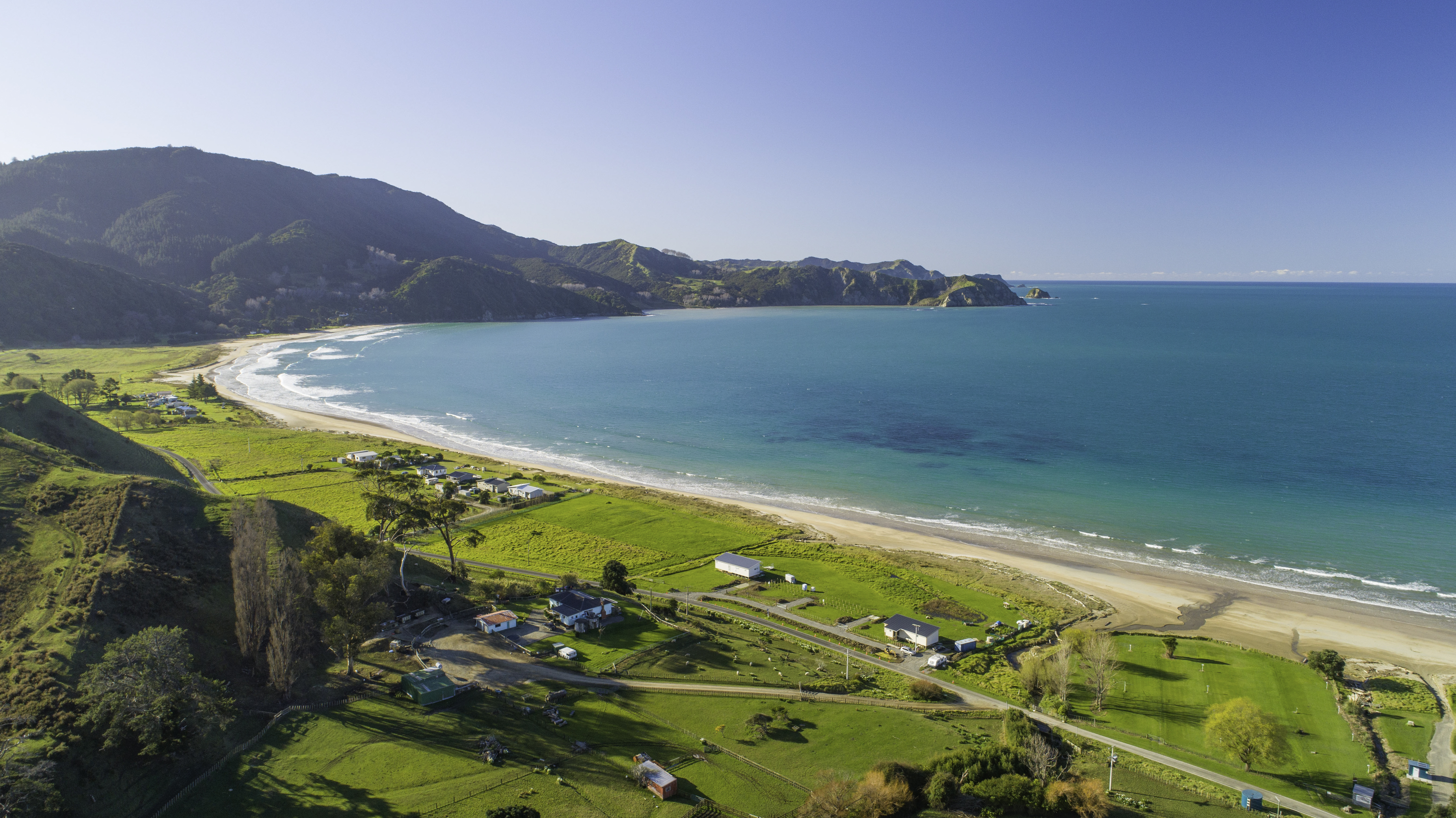 The view from the top of the hill approaching Anaura Bay is breath-taking. The blue Pacific Ocean with lace-like wavelets, rolling white sand, the dark island of Motuoroi looming in the background and the lush green pasture, are sites that draw hundreds of visitors to the sheltered bay each year.Retention of this environment whilst maintaining our business operations are paramount for Anaura.