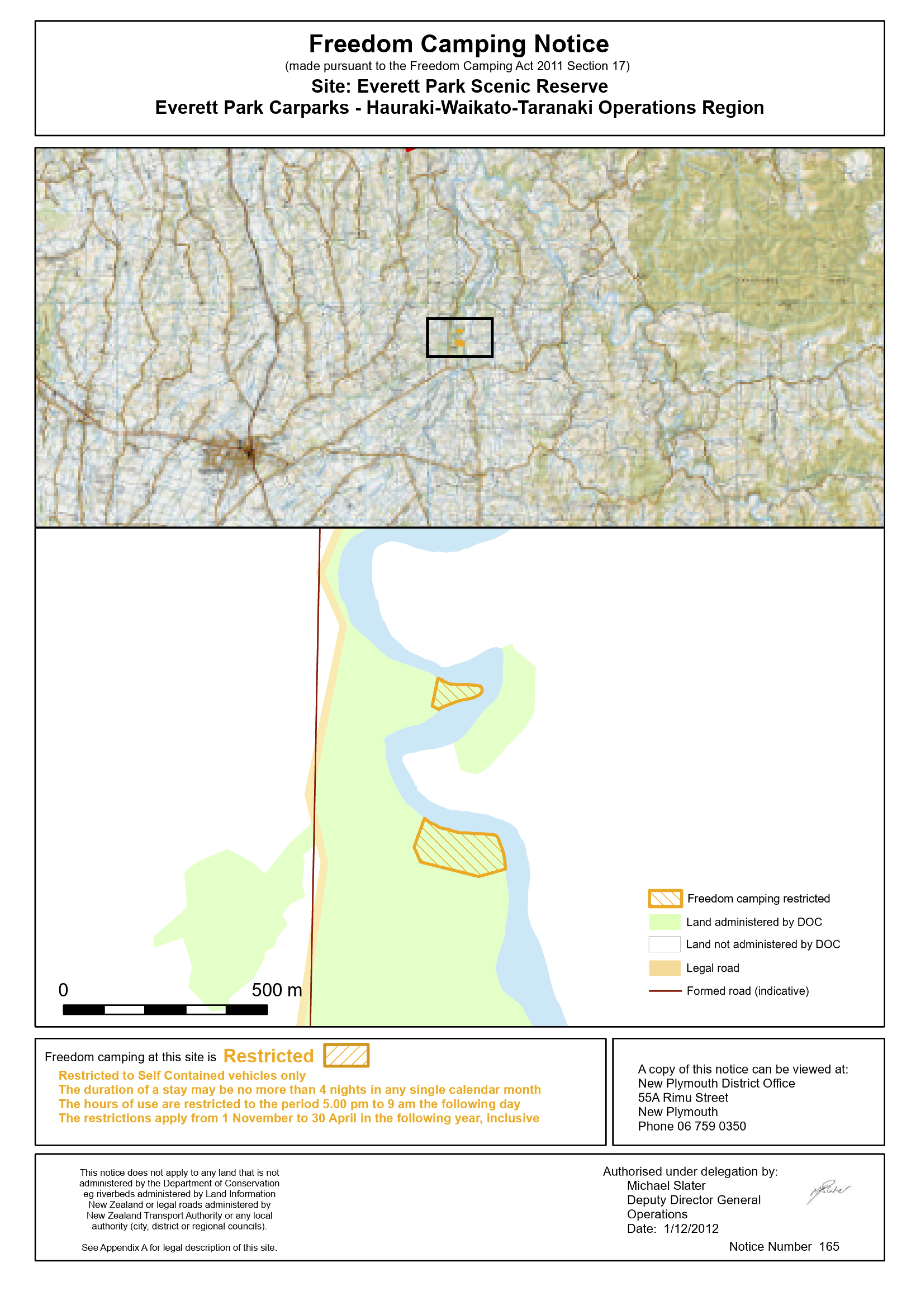 Everett Park Scenic Reserve - restricted to self contained vehicles, for 4 nights maximum in a single calendar month, between 5 pm and 9 am the following day, from 1 November to 30 April inclusive.