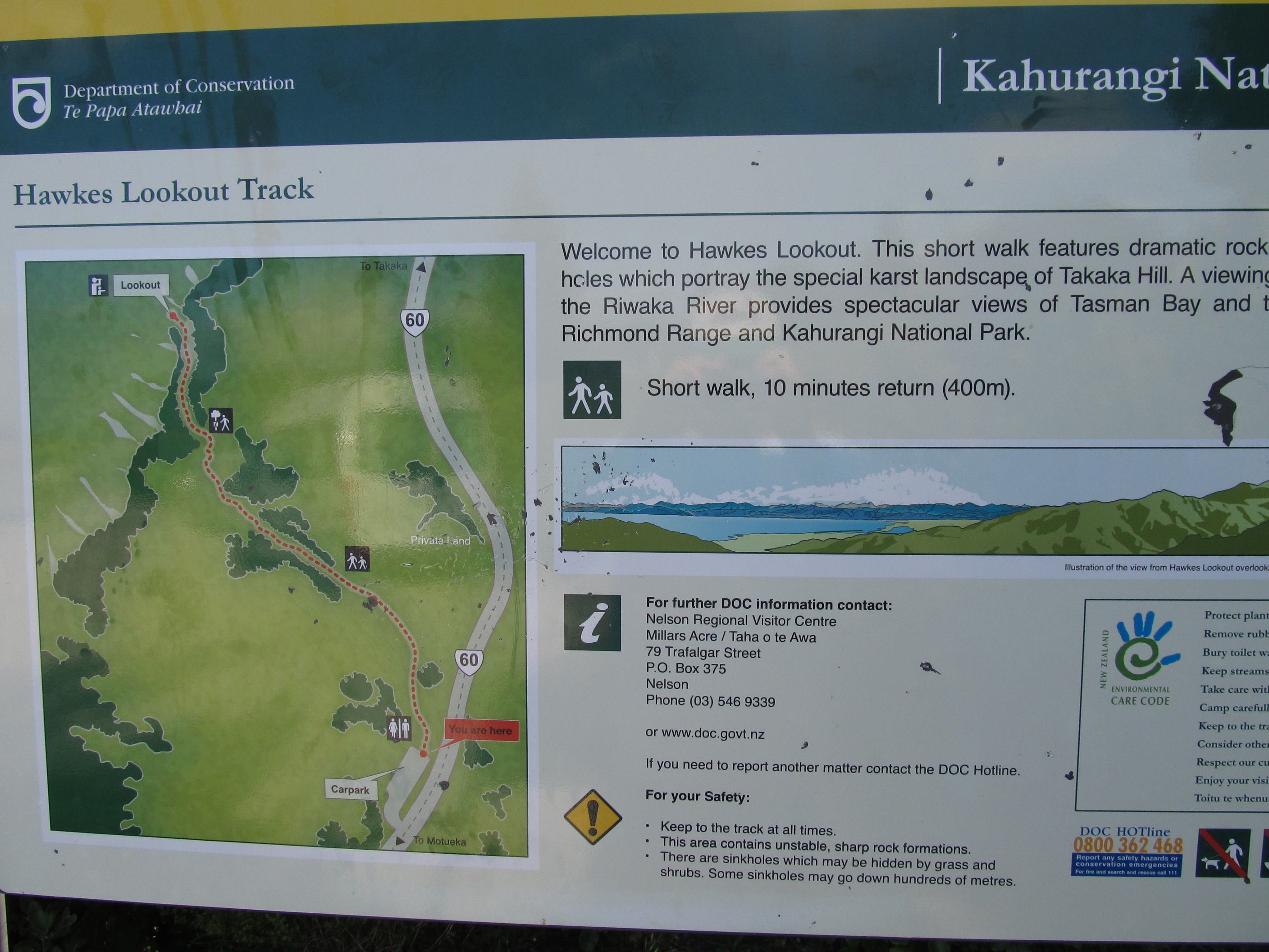 Hawkes Lookout carpark is situated next to the main road between Motueka and Golden Bay. This is karst country!