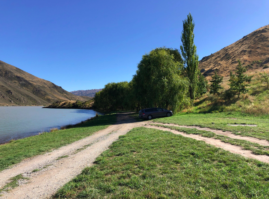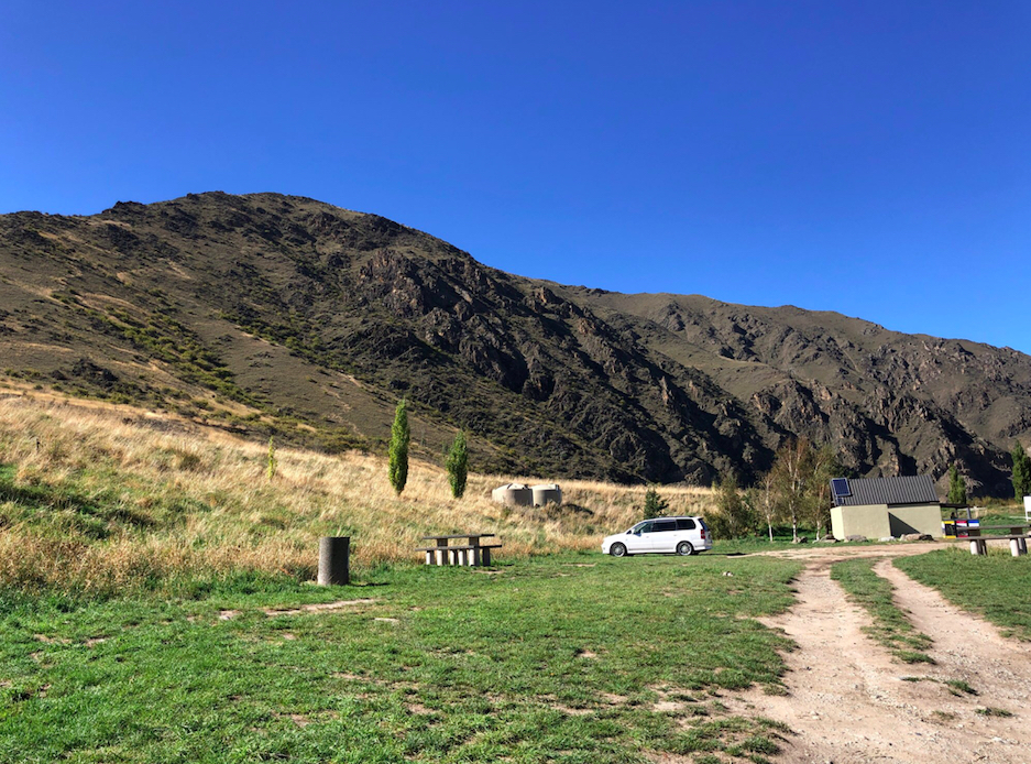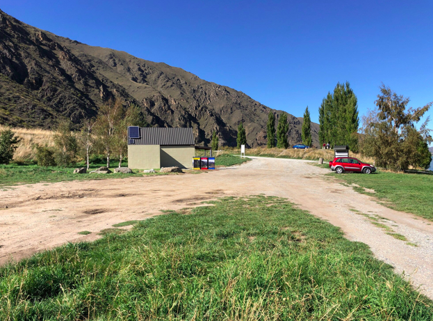 Toilets clean, area to wash dishes and there are bins. Although it says no dogs, there were plenty and all well-behaved. Great walk through the water race tunnel to grassed area on other side of road. The smell of thyme is devine. We parked up right next to the water, watched the bikers and runners across the lake on the Dunstan Trail. Although the road is adjacent, the noise was relatively quiet. We had great entertainment all day with families and jet boats, skiers, swimmers. Will definitely return to Champagne Gully.