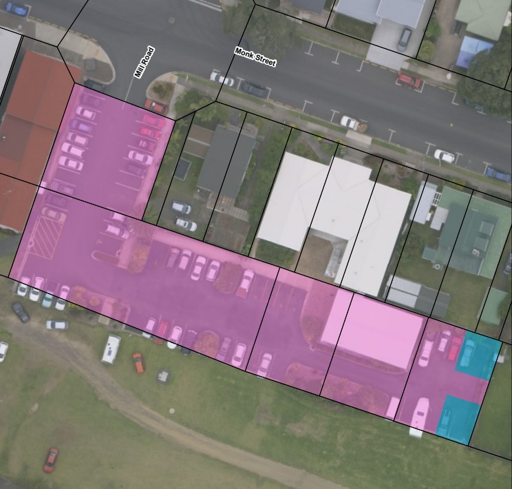 Size - 20m north to south across the car park and 6m or 2 car park spaces wide.