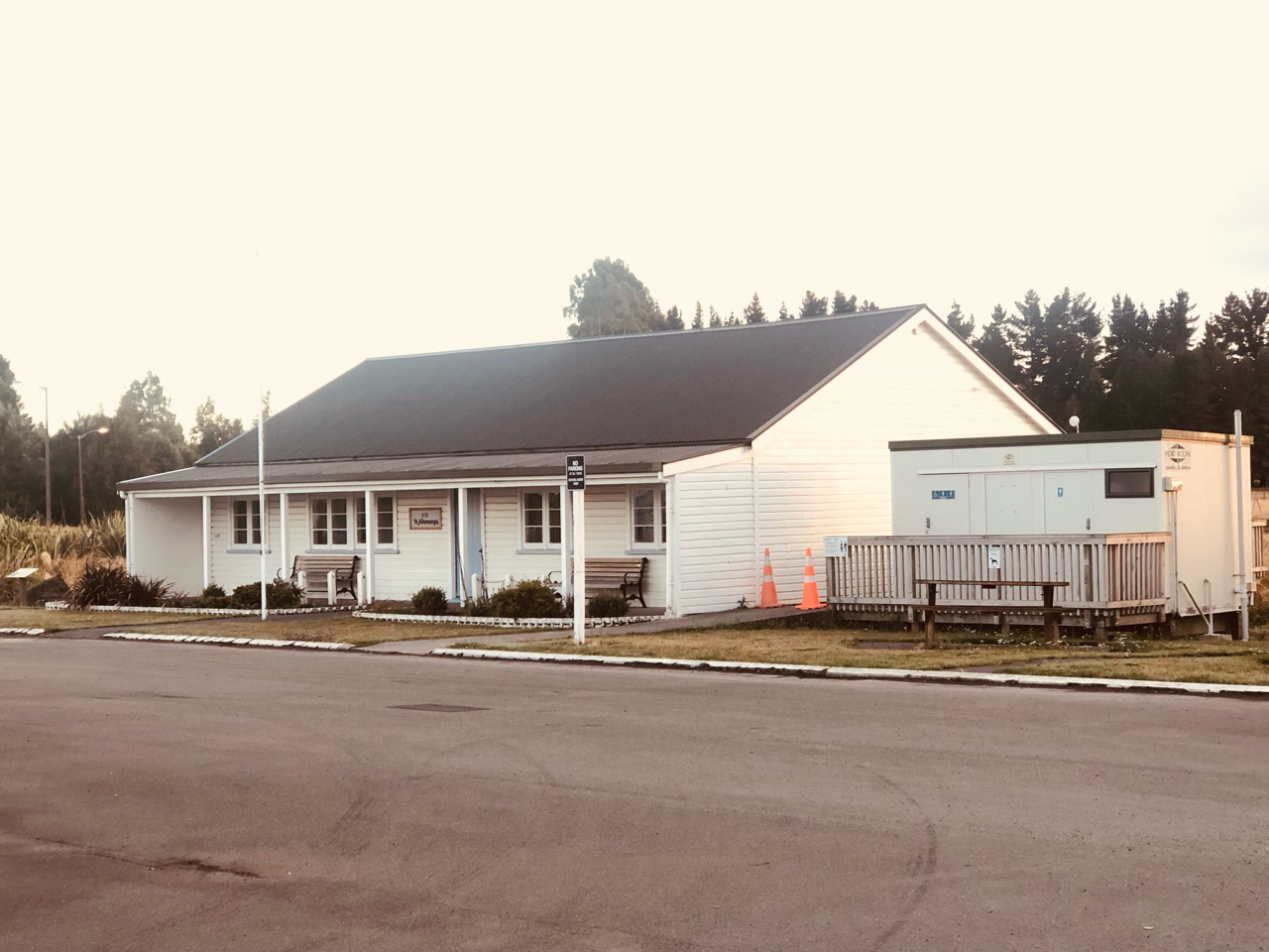 Toilets short walk across the highway. Plenty of space and Lovely view of the mountains. Donations can be left at reception in museum