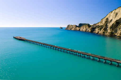 The world-famous Tolaga Bay Wharf reaches out into the blue Pacific for 660 metres, itself dwarfed by the massive cliffs of the nearby headland. It’s an East Cape tourer’s rite of passage to walk the length of this historic pier.