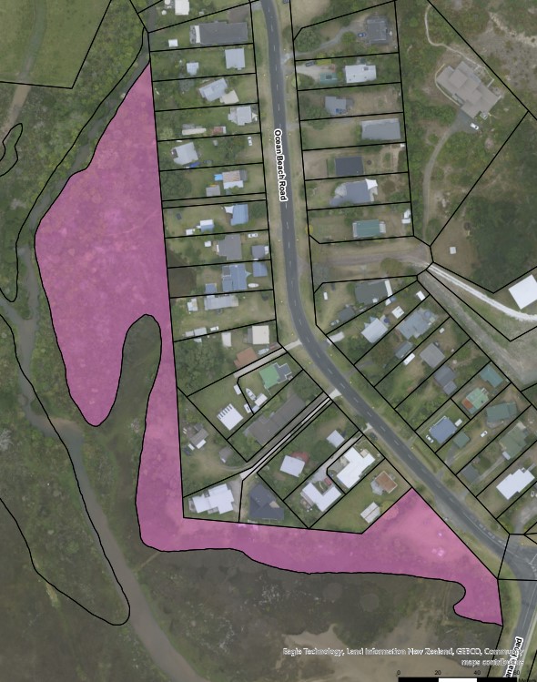 Size: Directly opposite 174 and 176 Ocean Beach Road, 38m north-west to south-east, 27m south-west to north-east.