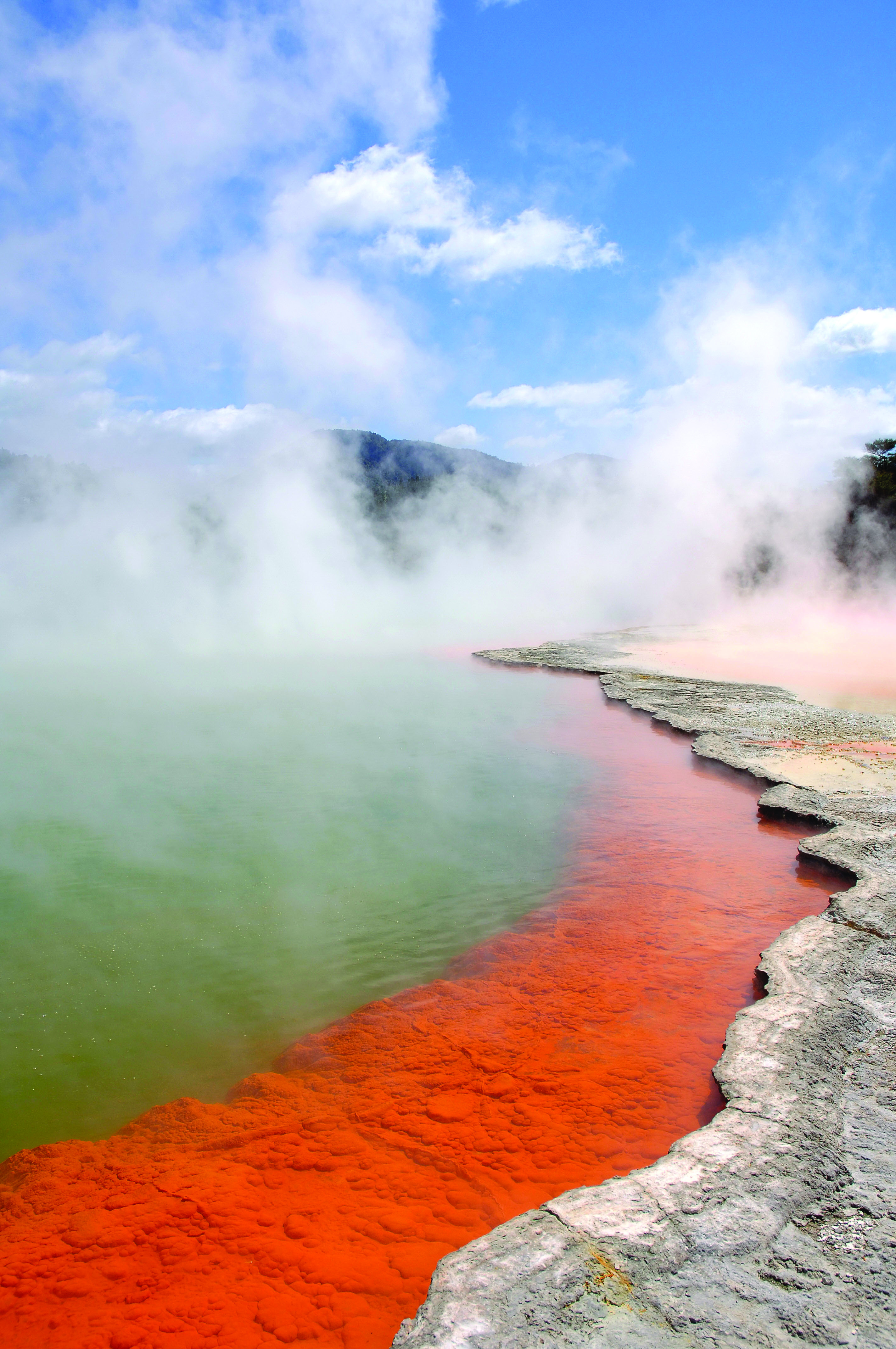 Explore spectacular nature at New Zealand's most colourful natural volcanic park. Walks through this unique geothermal area take between 30 and 75 minutes and provide a wide range of amazing photo opportunities at features including the world famous Champagne Pool, naturally coloured hot and cold springs, steaming ground, expansive vistas, huge volcanic craters and sinter terrace formations. The natural bush setting, the Lady Knox Geyser erupting daily at 10.15 am and the nearby ever active "Mud Pool" add other dimensions to the experience. The first class Visitor Centre incorporates cafe and retail facilities, and there are picnic areas and plenty of parking. Wai-O-Tapu is situated just 20 minutes drive south of Rotorua, or 40 minutes drive north of Taupo on State Highway 5.