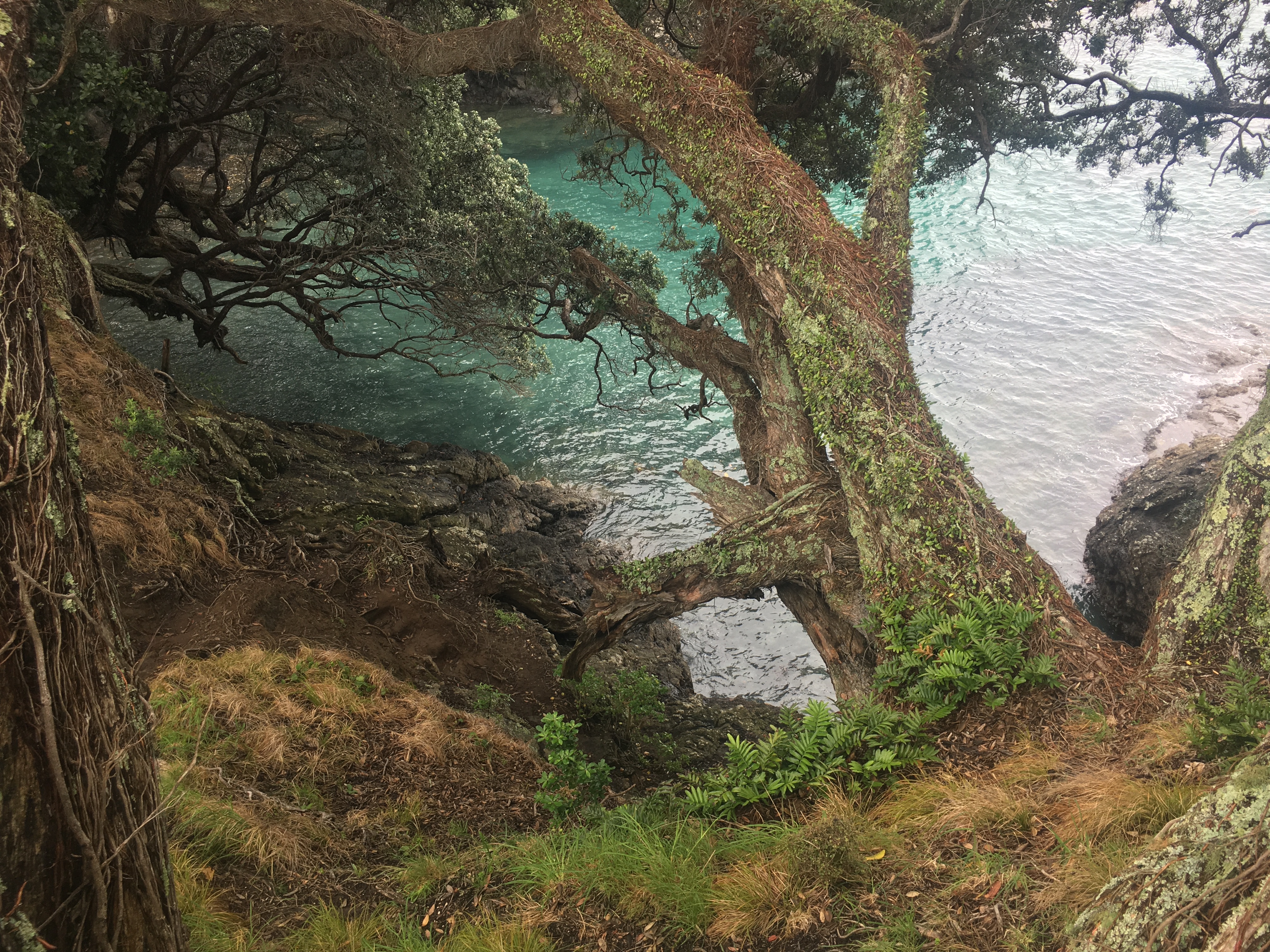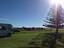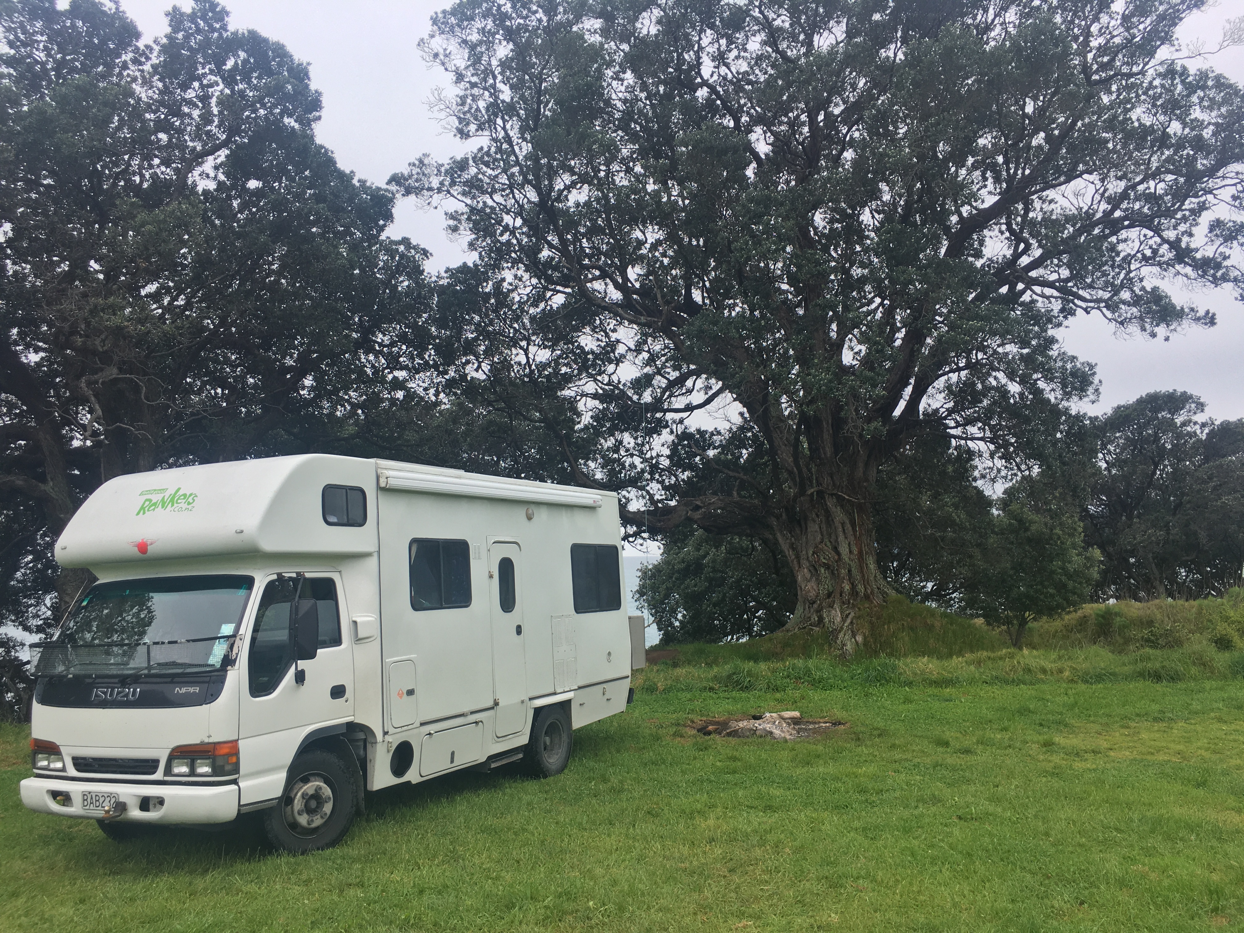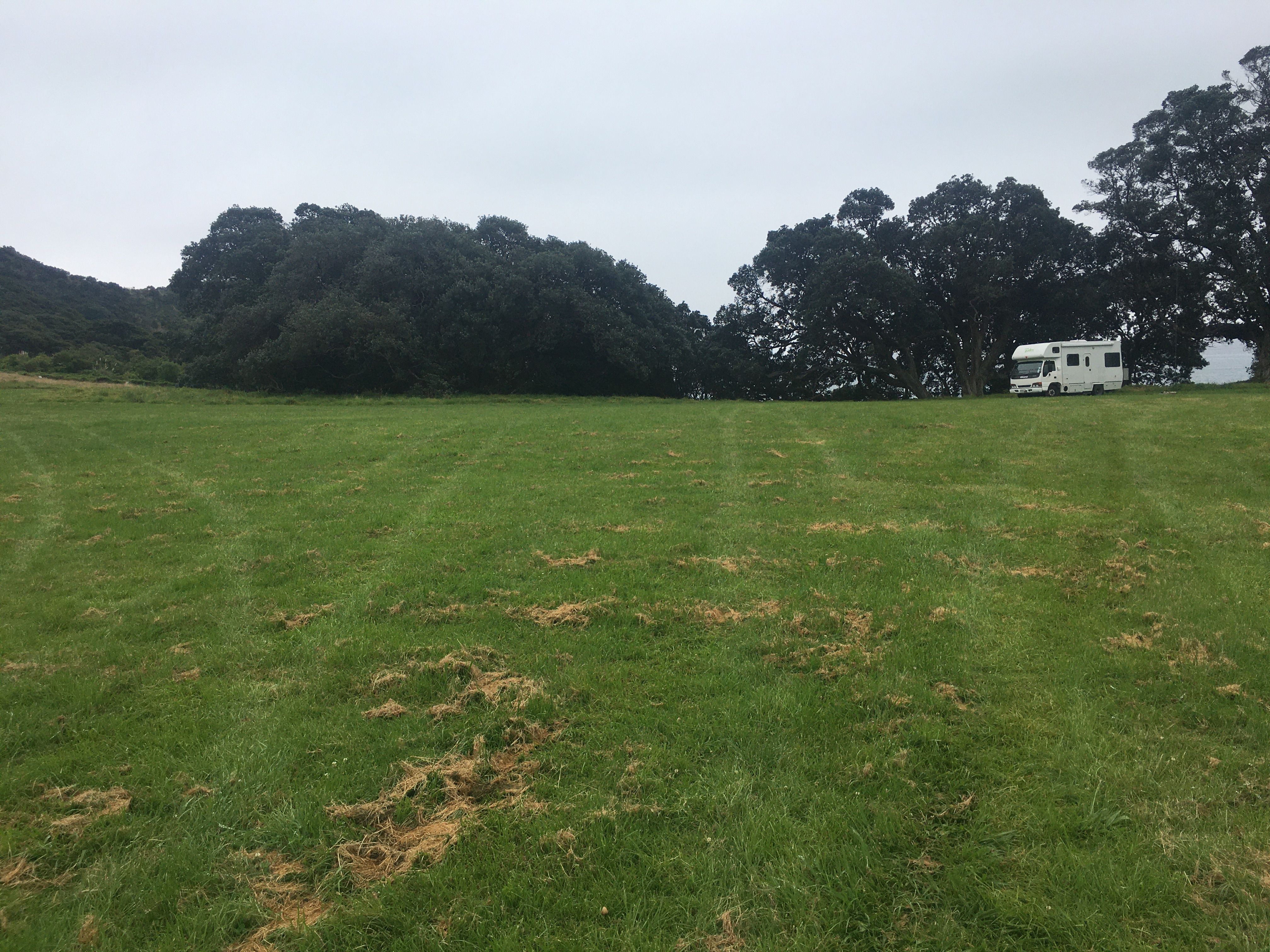 The camping field is elevated above the sea, behind mature Pohutukawa