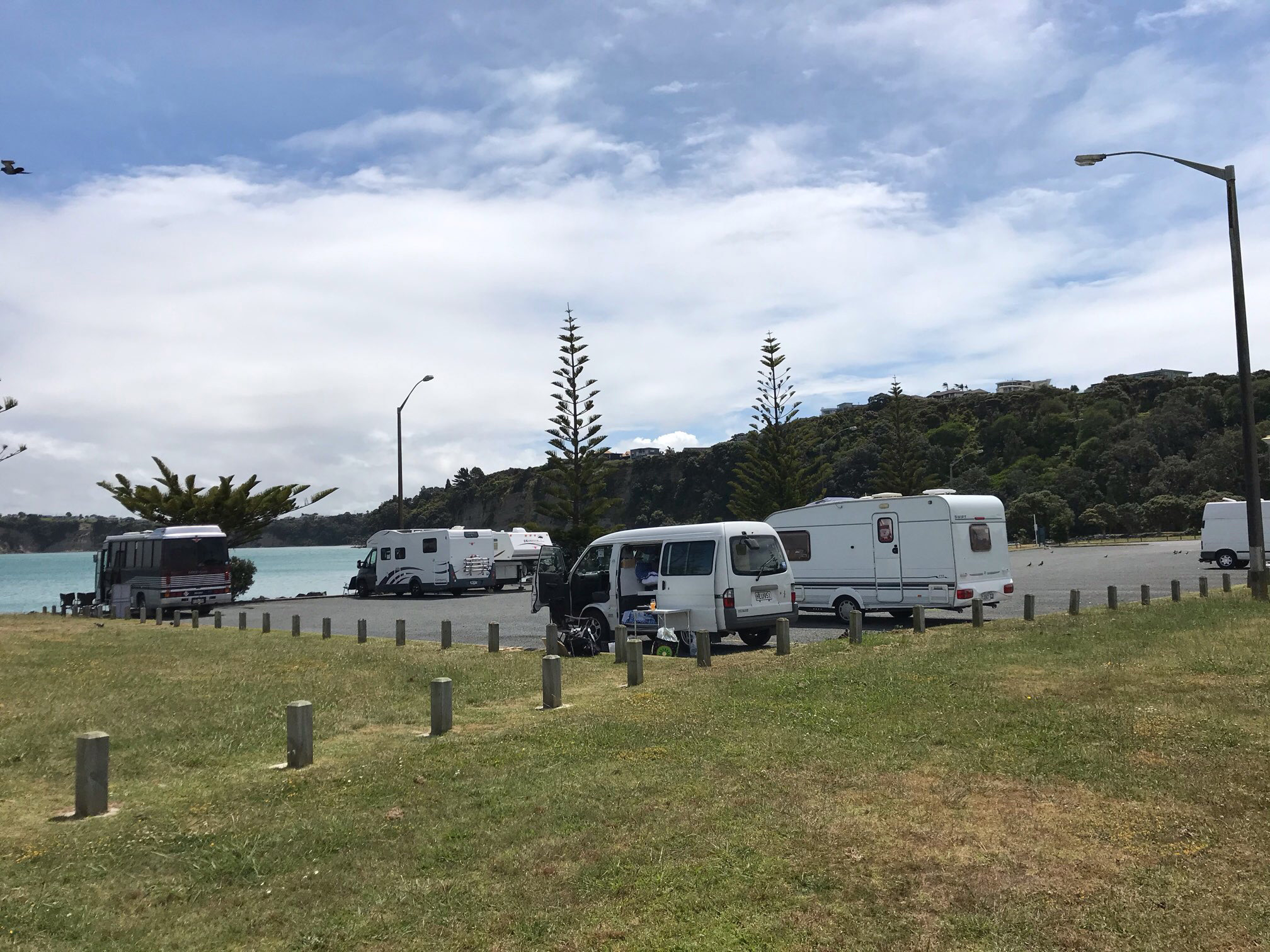 The signs clearly show the spaces where freedom camping vehicles are allowed (beyond the yellow line) but there were a number of campers parked outside of this (easily double the 10 spaces permitted), however we never saw any enforcement take place. The signage also says no trailers / caravans but there are several of them parked and some of them to appear to have been there quite some time and we assumed some are 'permanent' residents. The lighting overhead is quite bright so you will want to have good curtains to block it out while sleeping. The location is great, nice view of Auckland city in the distance at night and very quiet once the last of the ferry commuters leave. No issue with the washrooms.