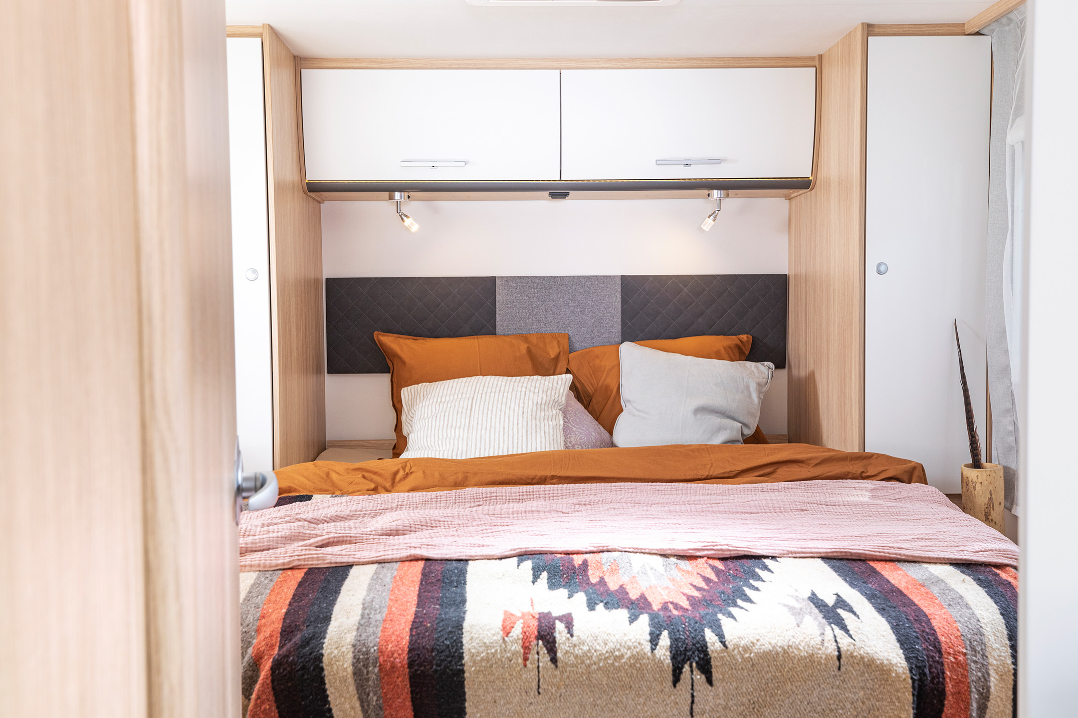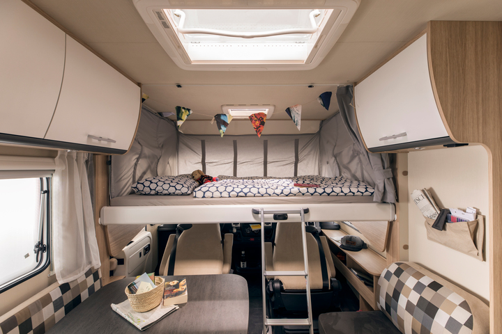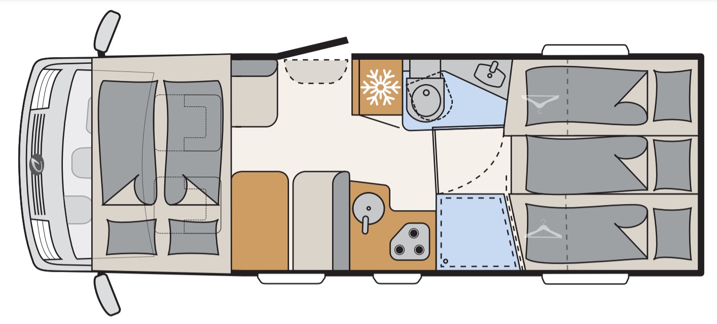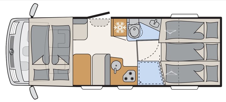 The front bed is a drop-down double. I am sure you will love the spaciousness and the great layout of the Comfort Luxury. Even though it has less beds than a 6-berth, this vehicle offers more interior space and comfort without having the extra bed be in the way. A three-step ladder provides easy access in and out of bed without having the bed being too high off the ground.