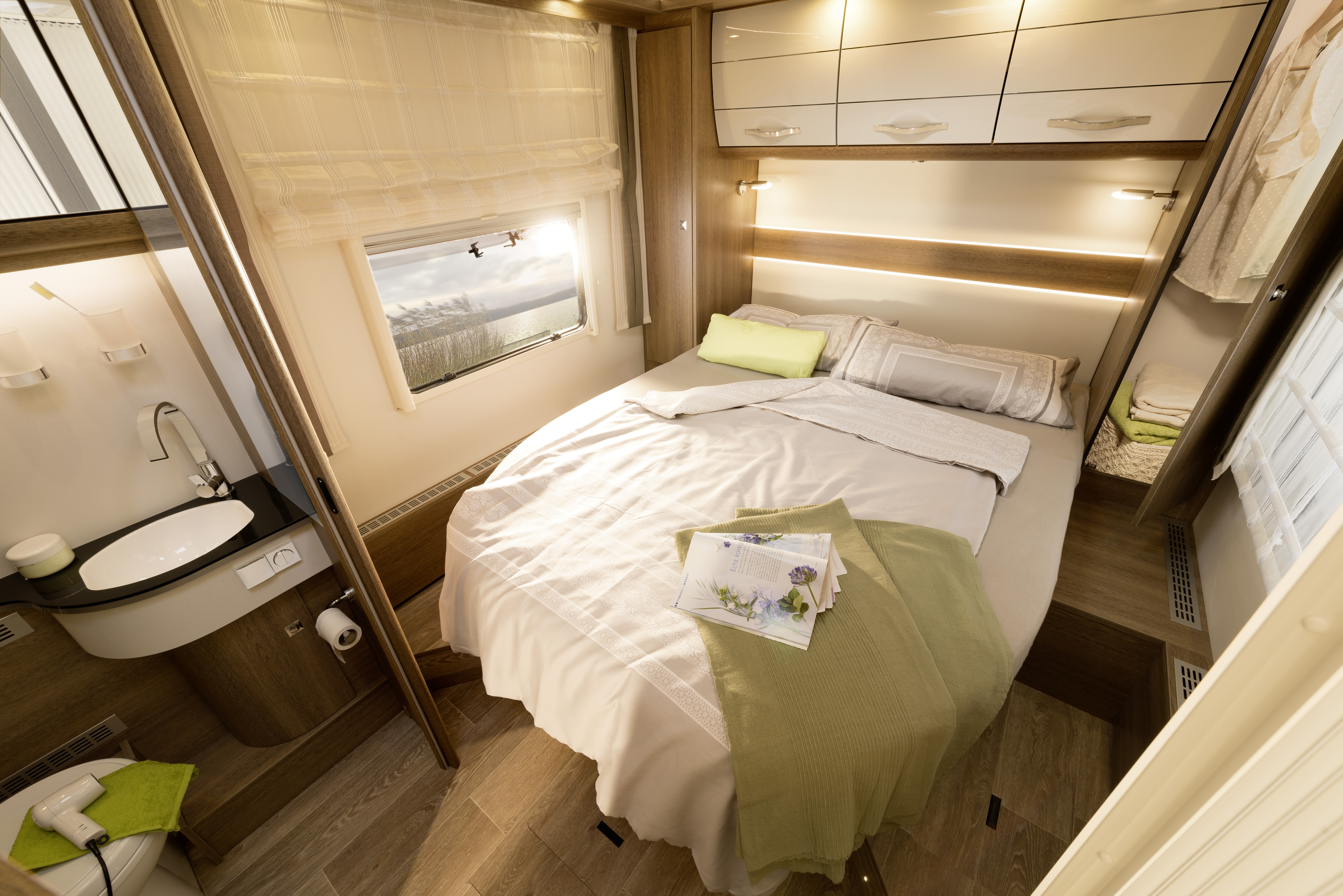 Choose one of the largest beds available in the market, the permanent 2.15m x 2m large King bed in the rear and a spacious kitchen and bathroom set up. The front seating area can comfortably seat multiple adults. Or opt for the most convenient option for anyone wanting the ease to get in and out of bed without hassles or ladders. The Queen-sized bed measuring 1.5m x 1.9m. This layout option allows to separate the bedroom in the rear from the front entertaining area with the help of a separation door.